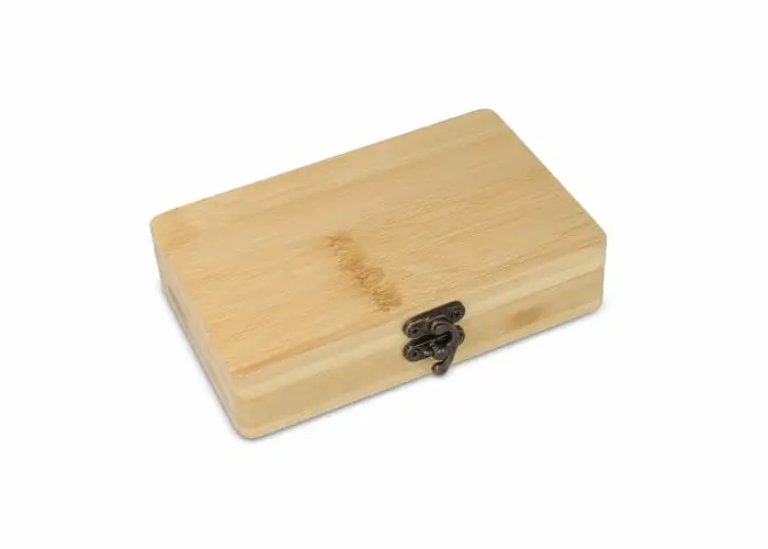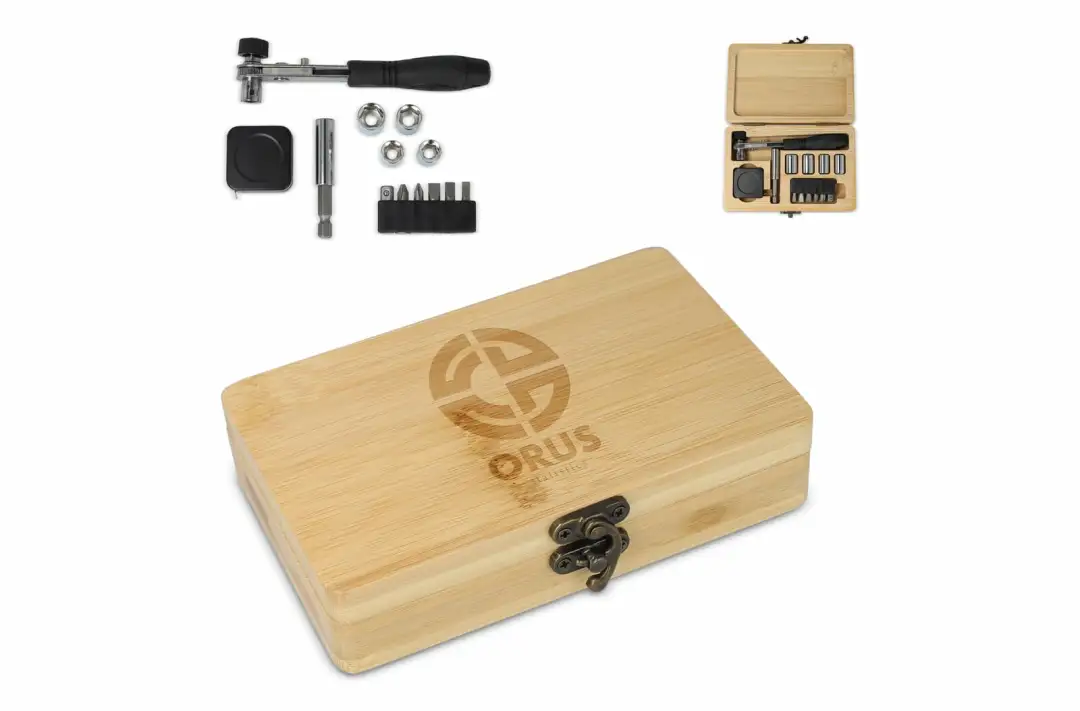 Poręczny 13-elementowy zestaw narzędzi w bambusowym pudełku: 1 x klucz z grzechotką; 1 x taśma miernicza 1m; 4 x nasadki 1/4 cala; 5 x końcówki wkrętakowe 25mm; 1 x ADP & 1 x złącze wkrętakowe