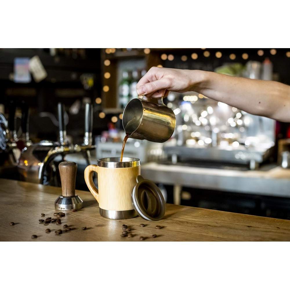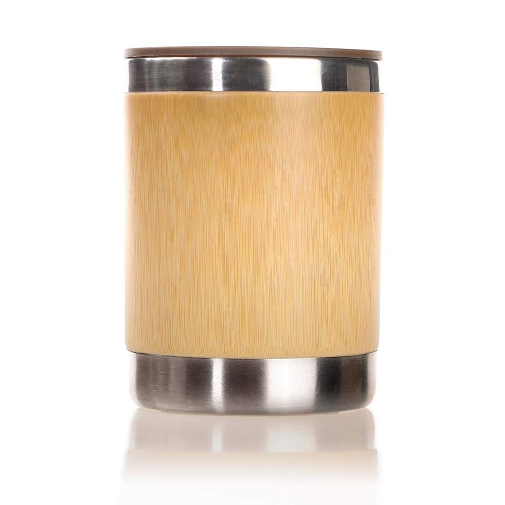Kubek termiczny 300 ml z rączką, bambusowe elementy na zewnątrz, wnętrze ze stali nierdzewnej, plastikowe wieczko, utrzymuje temperaturę napojów gorących do 4 godzin
