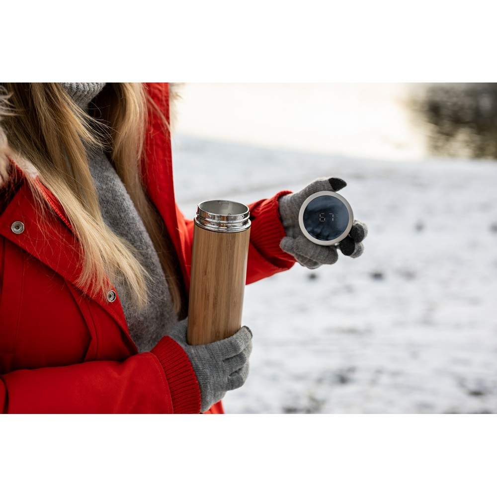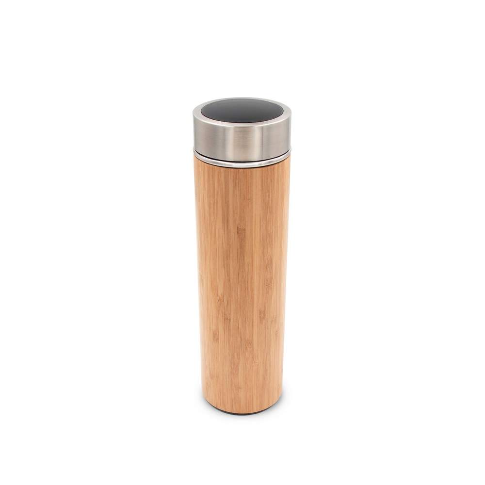 Bambusowy termos 500 ml, posiada wyjmowane sitko zatrzymujące fusy oraz zakrętkę z dotykowym cyfrowym wyświetlaczem temperatury napojów, podwójne ścianki ze stali nierdzewnej z próżnią między ściankami dzięki czemu długo utrzymuje temperaturę nie oddając jej na zewnątrz, utrzymuje temperaturę napojów gorących do 15 godzin +leakproof