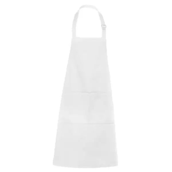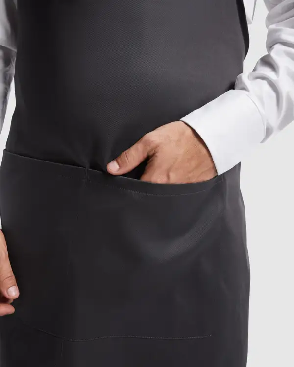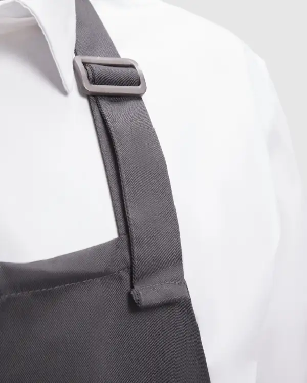 Długi fartuch z tkaniny o splocie ukośnym.· Pasek na szyję z pasującej tkaniny ze ściągaczem z tworzywa sztucznego.· Wiązania z pasującej tkaniny umożliwiające regulację w pasie.· Przednia kieszeń z szwem środkowym, dzielącym kieszeń na dwie części.