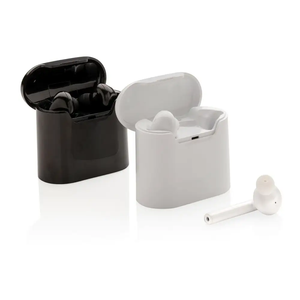 Bezprzewodowe słuchawki duszne, BT 5.0, wykonane z ABS, wbudowany mikrofon, etui z akumulatorem 400 mAh pełniące funkcję stacji ładującej w komplecie, akumulator słuchawek o pojemności 40 mAh umożliwia odtwarzanie muzyki na średnim poziomie głośności do 2 godzin, ponowne naładowanie za pomocą etui w 1 godzinę, zasięg do 10 m, 3 rozmiary nakładek dousznych w komplecie, ślad węglowy produktu: 0,84 kg CO2
