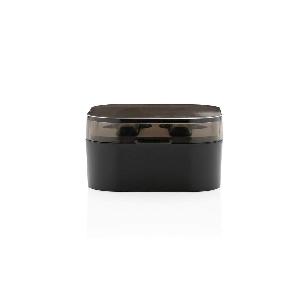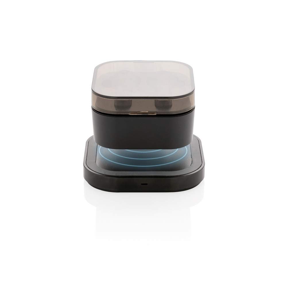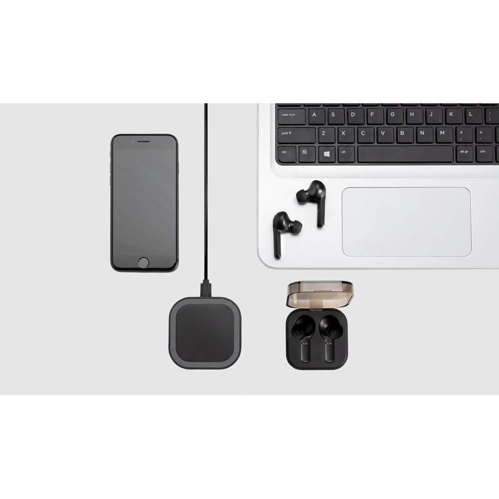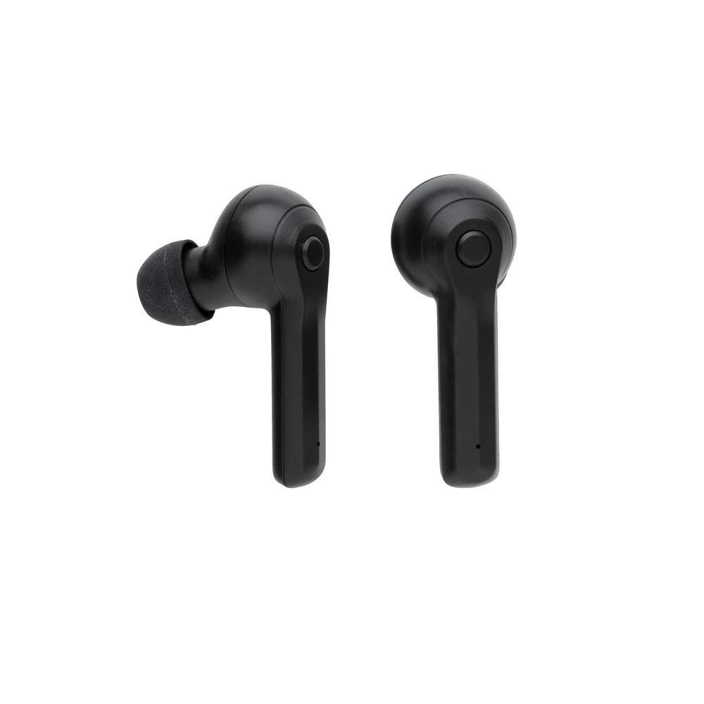 Bezprzewodowe słuchawki douszne TWS (True Wireless Stereo), BT 4.2, ładowarka bezprzewodowa 5W, słuchawki wykonane z ABS, odtwarzanie muzyki w stereo, funkcja odbierania połączeń (mono), etui pełniące funkcję stacji ładującej oraz ładowarka bezprzewodowa 5W w komplecie, ładowarka może służyć również do ładowania telefonu, bezprzewodowe ładowanie jest kompatybilne ze wszystkimi urządzeniami posiadającymi możliwość ładowania indukcyjnego, słuchawki posiadają wbudowany akumulator o pojemności 50 mAh umożliwiający odtwarzanie muzyki do 3 godzin, ponowne naładowanie za pomocą etui w 2 godziny, zasięg do 10 m, wejście 5V/1A, wyjście bezprzewodowe 5V/1A, kabel micro USB 150 cm oraz różne rozmiary nakładek dousznych w komplecie, ślad węglowy produktu: 1,86 kg CO2