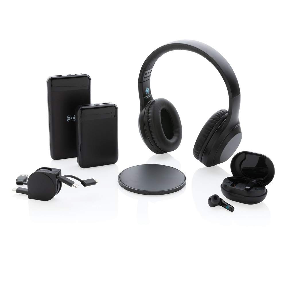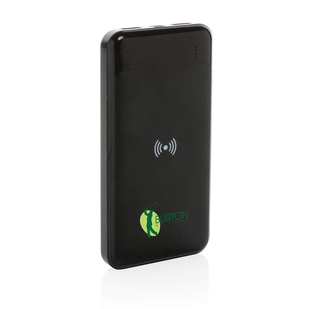 Power bank 8000 mAh, ładowarka bezprzewodowa 5W, w pełni naładowany, wbudowany akumulator litowo polimerowy klasy A pozwala na naładowanie telefonu do 4 razy, obudowa wykonana z ABS pochodzącego z recyklingu, posiadają certyfikat RCS (Recycled Claim Standard), który jest stosowany gdy produkt jest wykonany częściowo lub w całości z materiałów pochodzących z recyklingu, bezprzewodowe ładowanie jest kompatybilne ze wszystkimi urządzeniami posiadającymi możliwość ładowania indukcyjnego, wejście typu C 5V/2A, wejście micro USB 5V/2A, wyjście bezprzewodowe 5W, 2 x wyjście USB 5V/2A, kabel z TPE z recyklingu w komplecie, nie zawiera PVC, ślad węglowy produktu: 3,42 kg CO2