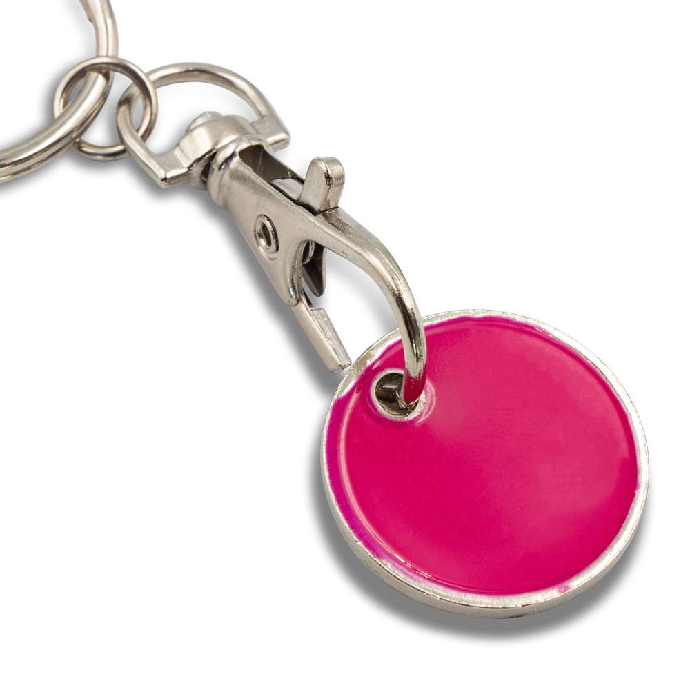 Brelok do kluczy z karabińczykiem umożliwiającym przypinanie, posiada wyjmowany żeton do wózka na zakupy w rozmiarze 1 zł, produkt wykonany z metalu