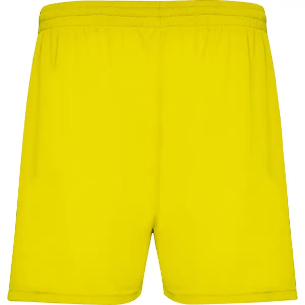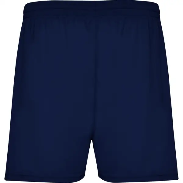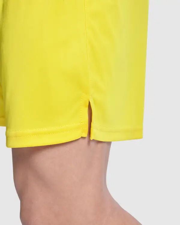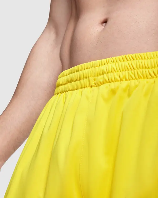 Krótkie spodenki sportowe. Wewnętrzna wkładka typu slip z siateczki. Elastyczna taśma w pasie i regulowany ściągacz. Boczne rozcięcia z detalami.