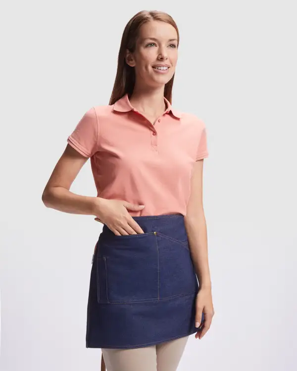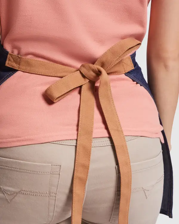 Krótki fartuch jeansowy.· Dwa kontrastowe, skośne wiązania umożliwiające regulację w pasie.· Przednia kieszeń z szwem środkowym, dzielącym kieszeń na dwie części.· Kieszeń na długopis po prawej stronie.· Kieszeń wewnętrzna po lewej stronie.· Zewnętrzna etykieta Roly WRK.