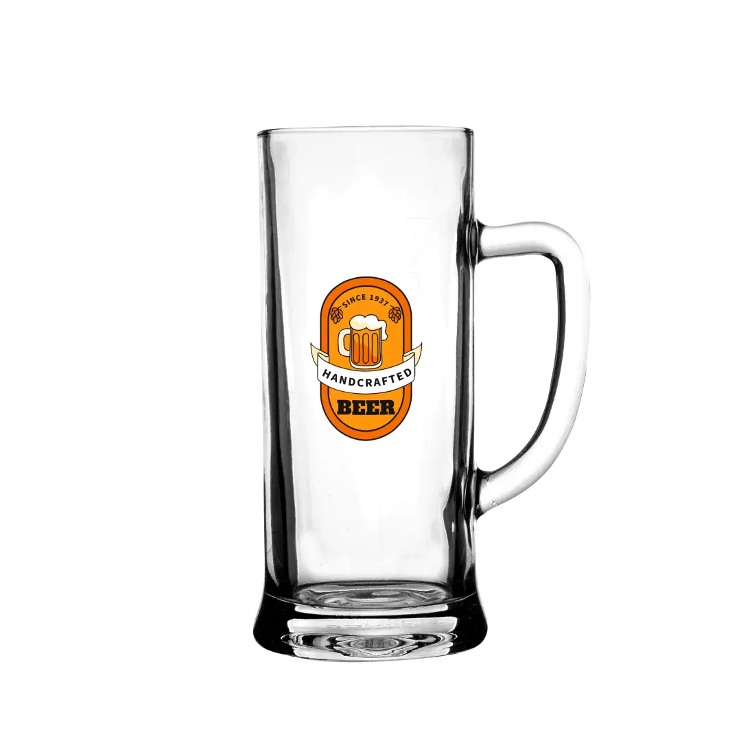 Wysoki kufel o prostych ściankach wykonany z grubościennego szkła. Posiada wygodny uchwyt i duże mozliwości w zakresie zdobień. Produkowany w Europie.