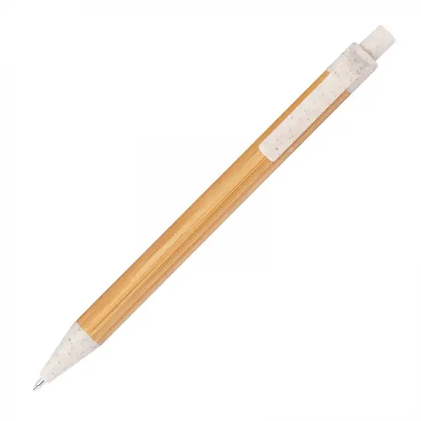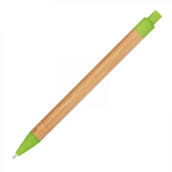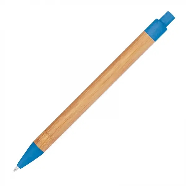 Długopis wykonany z bambusa z kolorowymi elementami wykonanymi z włókna pszenicznego. Posiada klikany mechanizm i wkład w kolorze niebieskim.