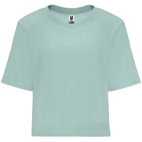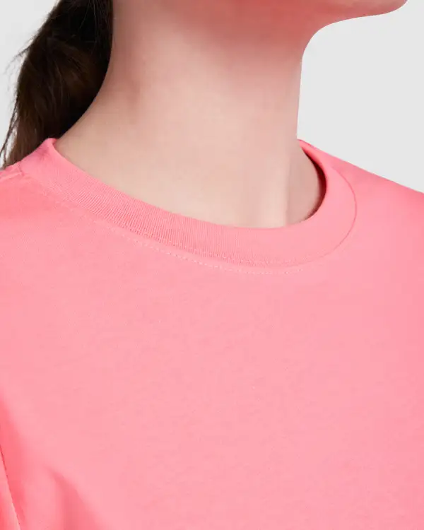 Koszulka z krótkim rękawem o krótszym i luźniejszym kroju. Szeroki, prążkowany, okrągły dekolt 1x1. Taśma kryjąca przeszycie na karku z dopasowanej tkaniny.