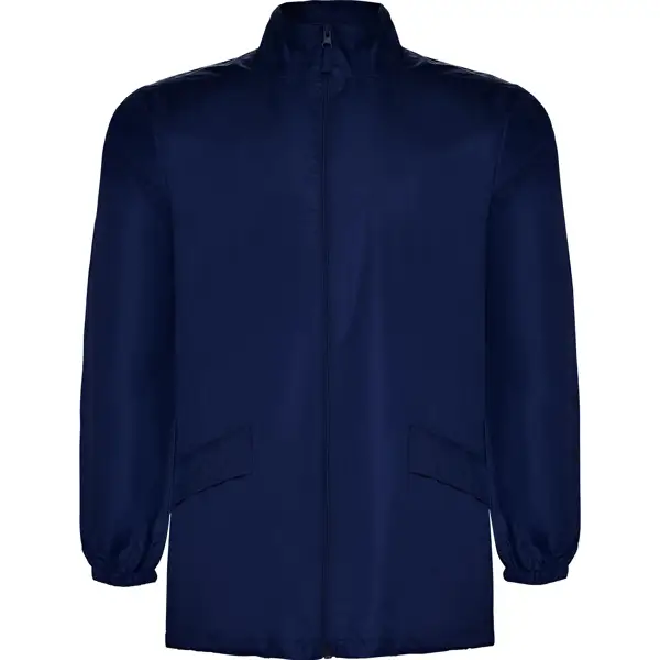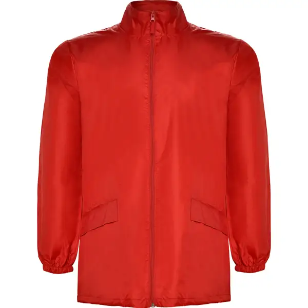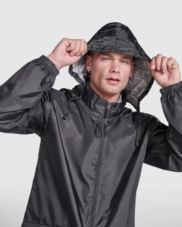 Płaszcz przeciwdeszczowy z wysokim kołnierzem i odpinanym kapturem z regulowanym sznurkiem. Wodoodporny i wiatroszczelny. Wnętrze z powłoką srebrną. Dopasowany zamek błyskawiczny z przodu. Kieszenie boczne z zamkiem błyskawicznym, zakrytym klapą z tej samej tkaniny. Elastyczne mankiety. Obszycie z wewnętrznym ściągaczem. Wewnętrzna kieszeń z elastycznym paskiem do składania i przechowywania.
