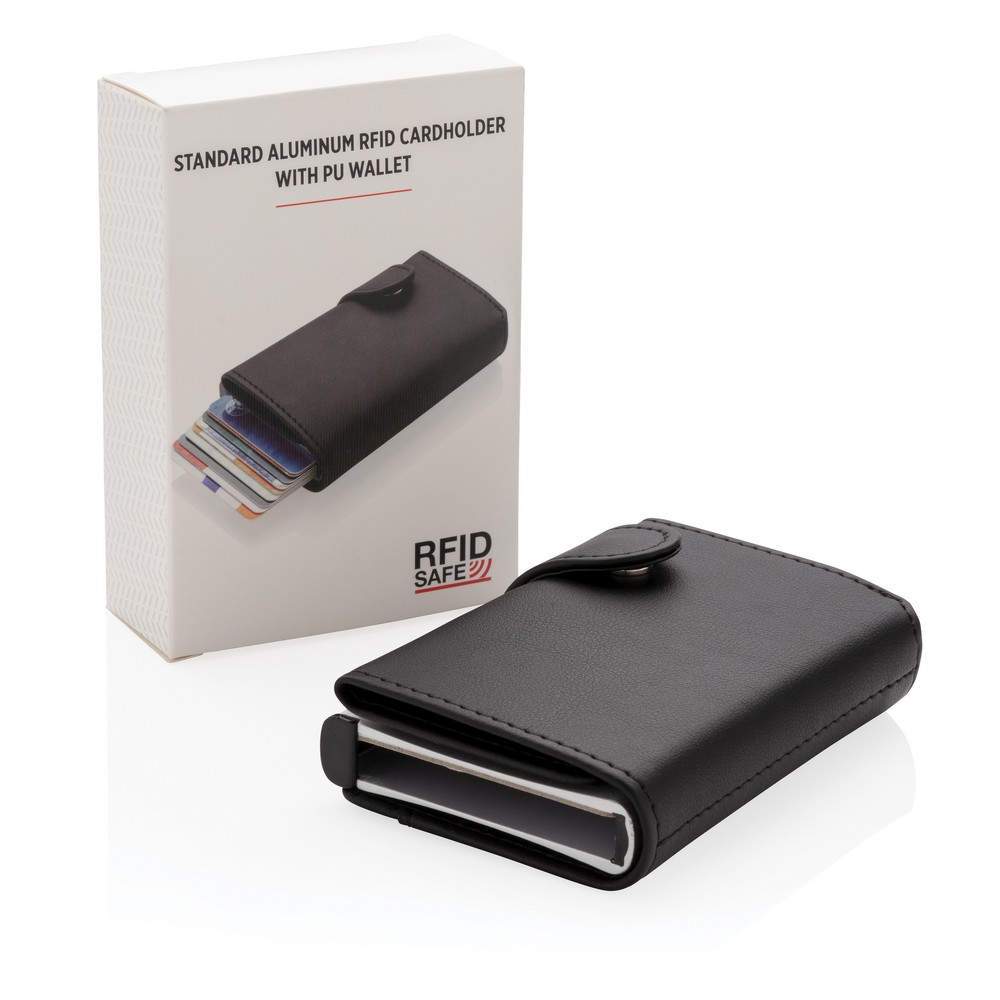 Etui na karty kredytowe, portfel z ochroną RFID, etui wykonane z wytrzymałego aluminium, portfel z PU, mieści do 10 kart lub do 6 z tłoczeniem, posiada suwak boczny do wysuwania kart, ślad węglowy produktu: 0,81 kg CO2
