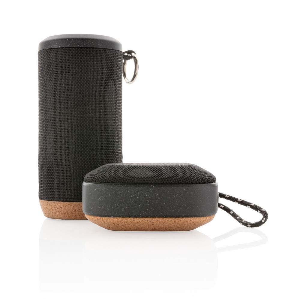Głośnik bezprzewodowy 5W, BT 4.2, wodoodporny IPX5 (całkowita ochrona przed strumieniem wody płynącej z różnych kierunków z wydajnością do 12,5 litra na minutę), wykonany z wytrzymałej tkaniny, spód wykonany z organicznego korka, akumulator o pojemności 1000 mAh umożliwia odtwarzanie muzyki do 8 godzin, zasięg do 10 m, w trosce o środowisko naturalne opakowanie głośnika nie zawiera plastiku, wzór zastrzeżony®, ślad węglowy produktu: 2,26 kg CO2