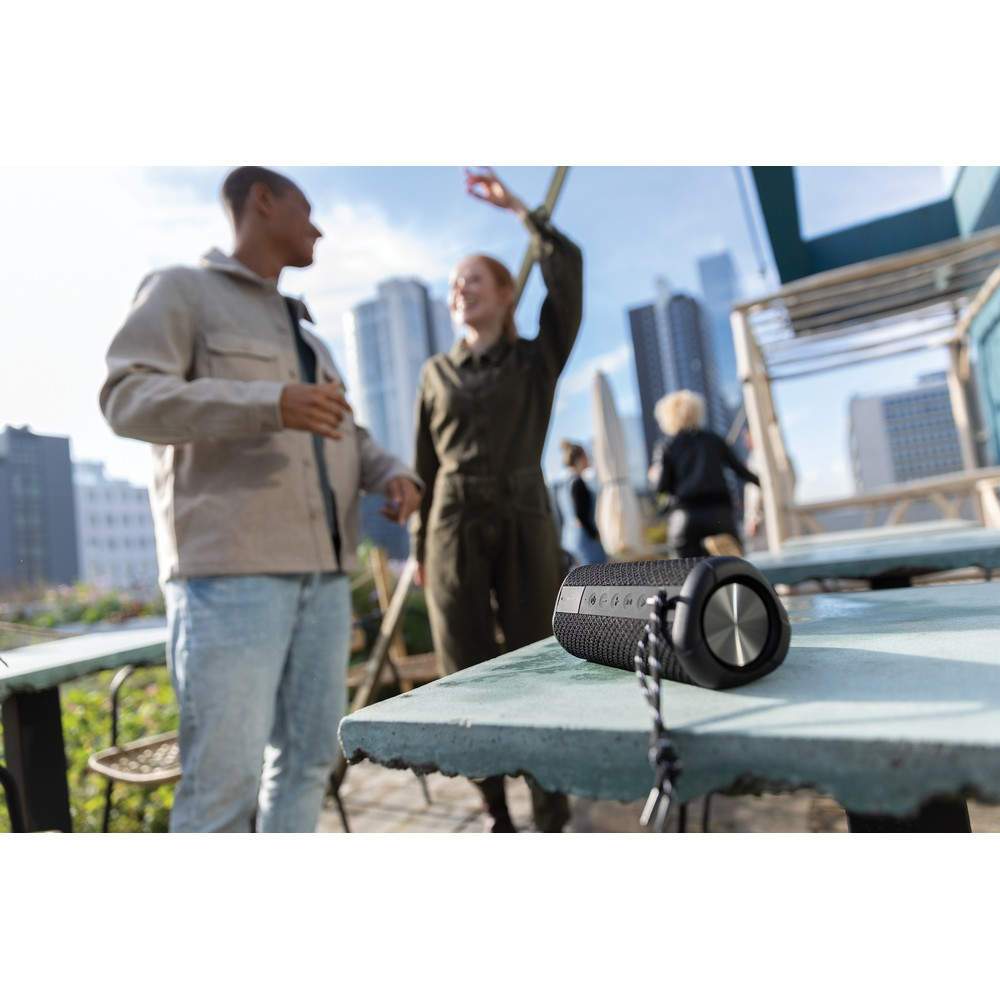 Głośnik bezprzewodowy 10W, wodoodporny IPX7 (do 30 min zanurzenia na głębokości do 1 m), wbudowany mikrofon, funkcja odbierania połączeń, do 15 godzin odtwarzania na jednym ładowaniu, mocny bas dzięki dwóm zintegrowanym głośnikom niskotonowym, wytrzymała obudowa i mocna tkanina, produkt nie zawiera PVC, opakowanie nie zawiera plastiku, ślad węglowy produktu: 4,16 kg CO2