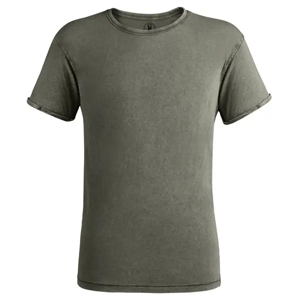Koszulka z krótkim rękawem z bocznymi szwami i efektem sprania. Czesana bawełna. Prążkowany okrągły dekolt 1x1. Taśma kryjąca przeszycie na karku z dopasowanej tkaniny. Podwójne szwy po bokach i wycięciach na ramiona. Dekoracyjne szwy na rękawach i obszyciu ze wzmocnionymi detalami na obszyciu.