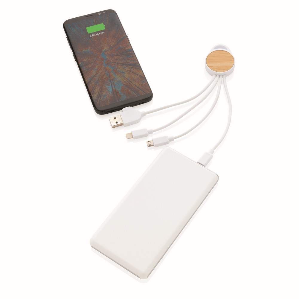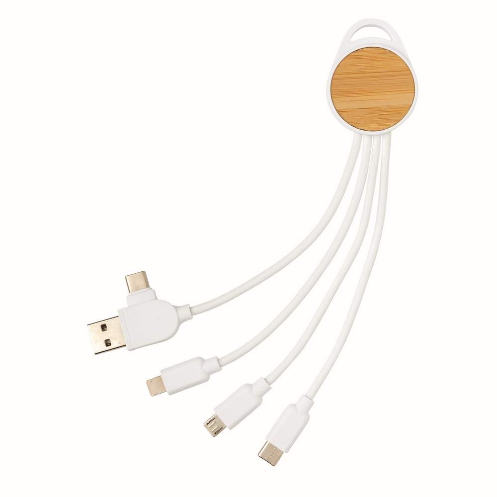 Kabel do ładowania, końcówki: USB, 2 x USB C, micro USB, iOS, obudowa wykonana z bambusa z certyfikatem FSC® i ABS z recyklingu, kabel wykonany z TPE z recyklingu, kabel i obudowa posiadają certyfikaty RCS, długość 20 cm, nie zawiera PVC, ślad węglowy produktu: 0,15 kg CO2