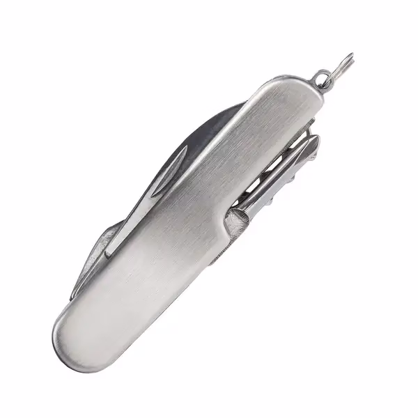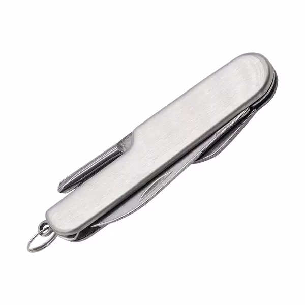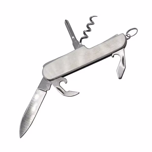 Stalowy scyzoryk wyposażony w ostrze główne, korkociąg, śrubokręt krzyżowy, otwieraczem do butelek, otwieracz do konserw oraz kółeczko do mocowania.