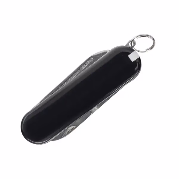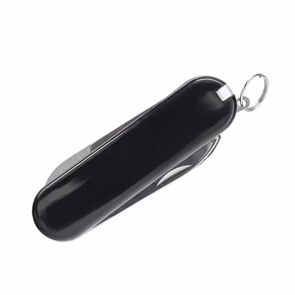 Kompaktowy scyzoryk wielofunkcyjny z ostrzem, pilnikiem, nożyczkami, pęsetą, wykałaczką i kółkiem do mocowania – idealny na co dzień i w podróży.