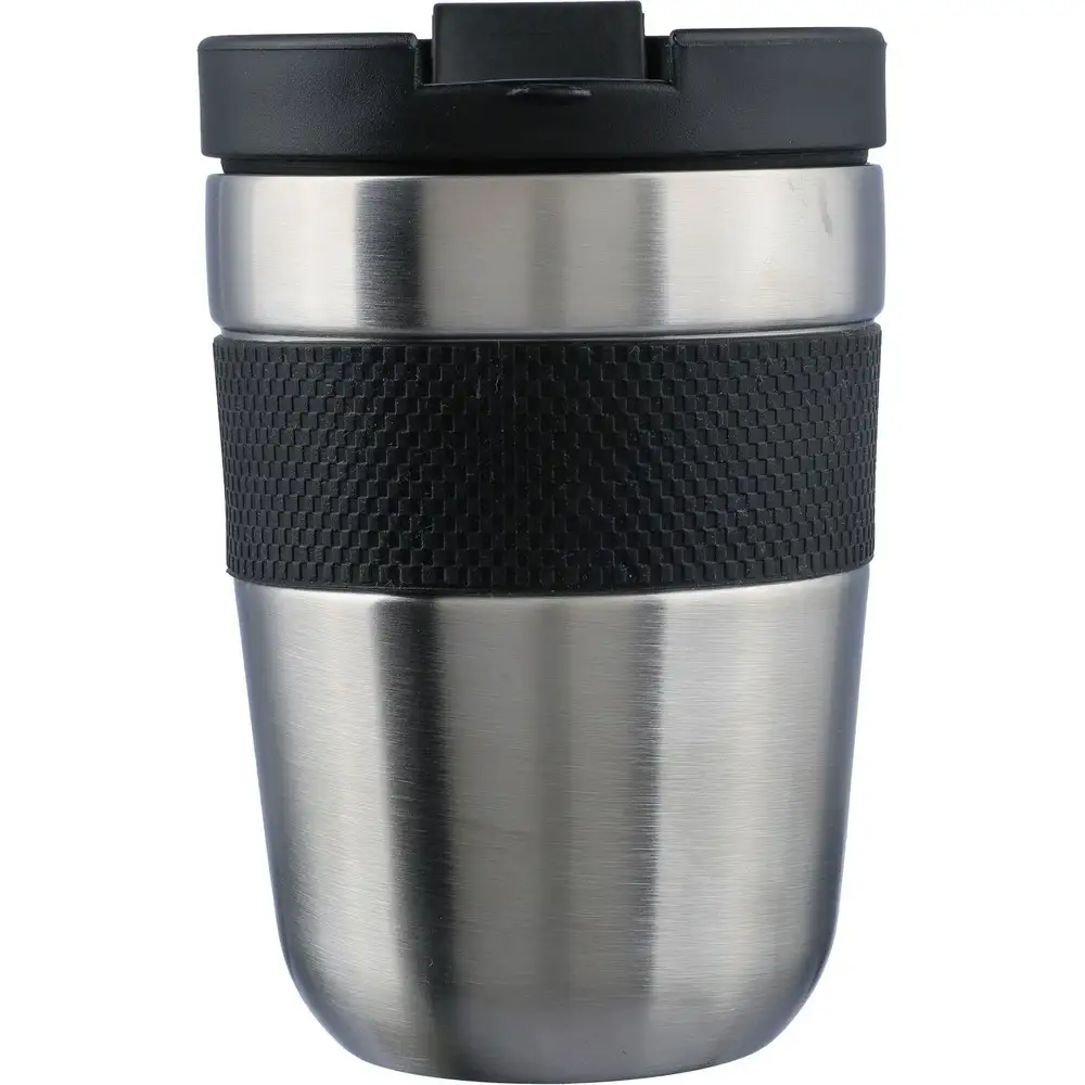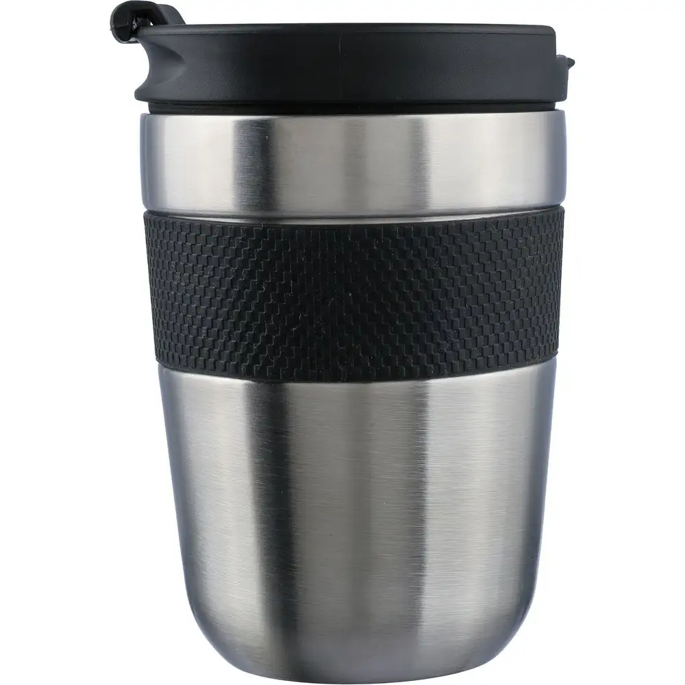 Kubek termiczny 300 ml posiada podwójne ścianki ze stali nierdzewnej z próżnią między ściankami, co spowalnia oddawanie temperatury na zewnątrz, zachowując funkcje termosu, silikonowy uchwyt zwiększający wygodę użytkowania, zapakowana w brązowy kartonik, produkt wykonany ze stali nierdzewnej, PP, silikonu