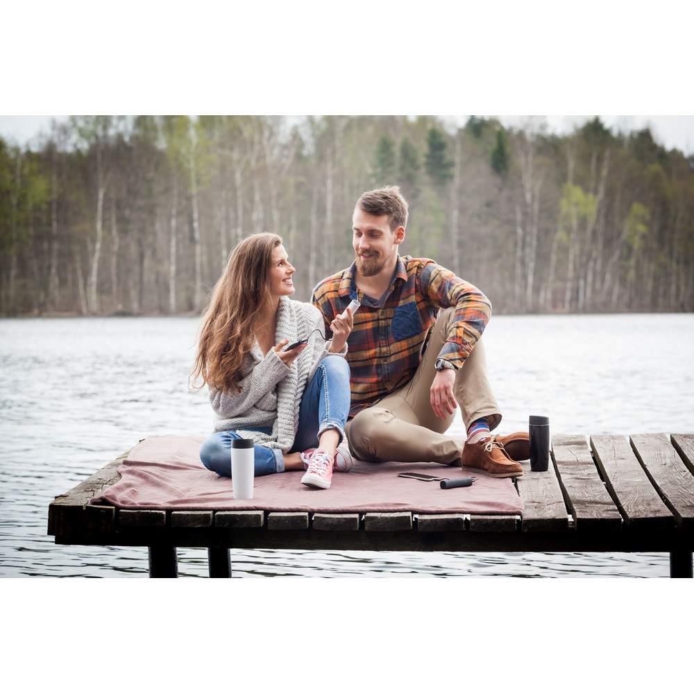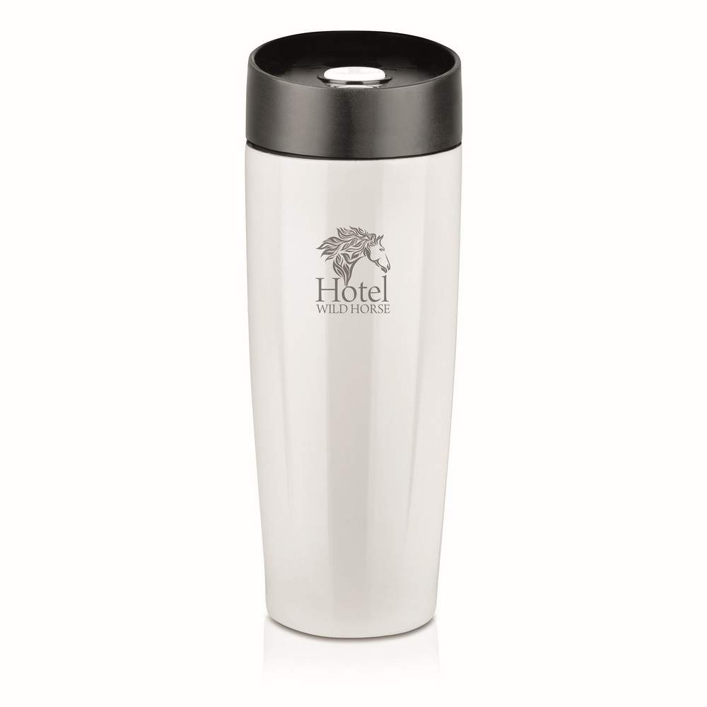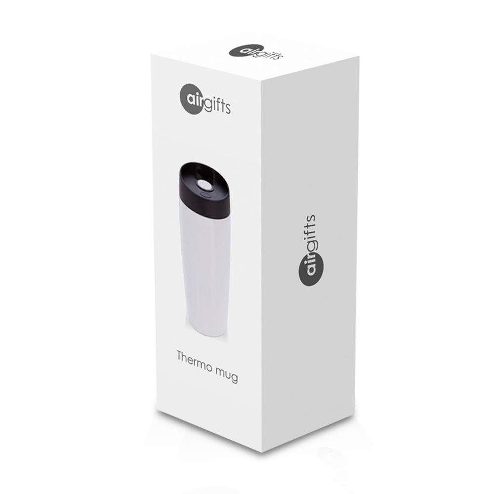 Kubek termiczny 375 ml Air Gifts, posiada podwójne ścianki ze stali nierdzewnej z miedzianą izolacją próżniową, co spowalnia oddawanie temperatury na zewnątrz, zachowując funkcje termosu, plastikowe wieczko z przyciskiem otwarcia/zamknięcia ustnika umożliwiającym obsługę jedną ręką, błyszczące wykończenie, utrzymuje temperaturę napojów gorących do 10 godzin +leakproof