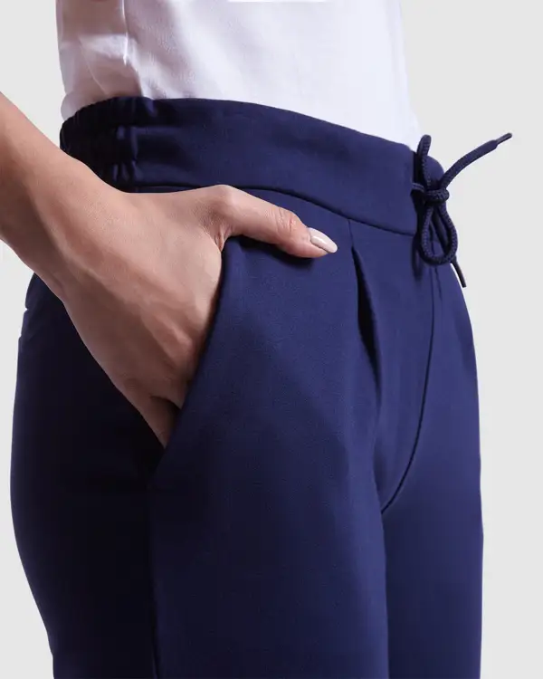 Spodnie z elastycznej tkaniny z elastyczną taśmą w pasie z tyłu i regulowanym przednim ściągaczem z metalowymi oczkami w tym samym kolorze. Plisy przednie. Dwie boczne kieszenie. Dwa ozdobne wykończenia z tyłu, które imitują kieszenie.