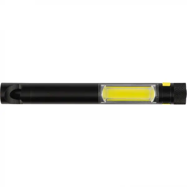 Aluminiowa latarka z żarówką LED COB z otwieraczem do butelek, klipsem i magnetyczną podstawką. Produkt zawiera baterie.