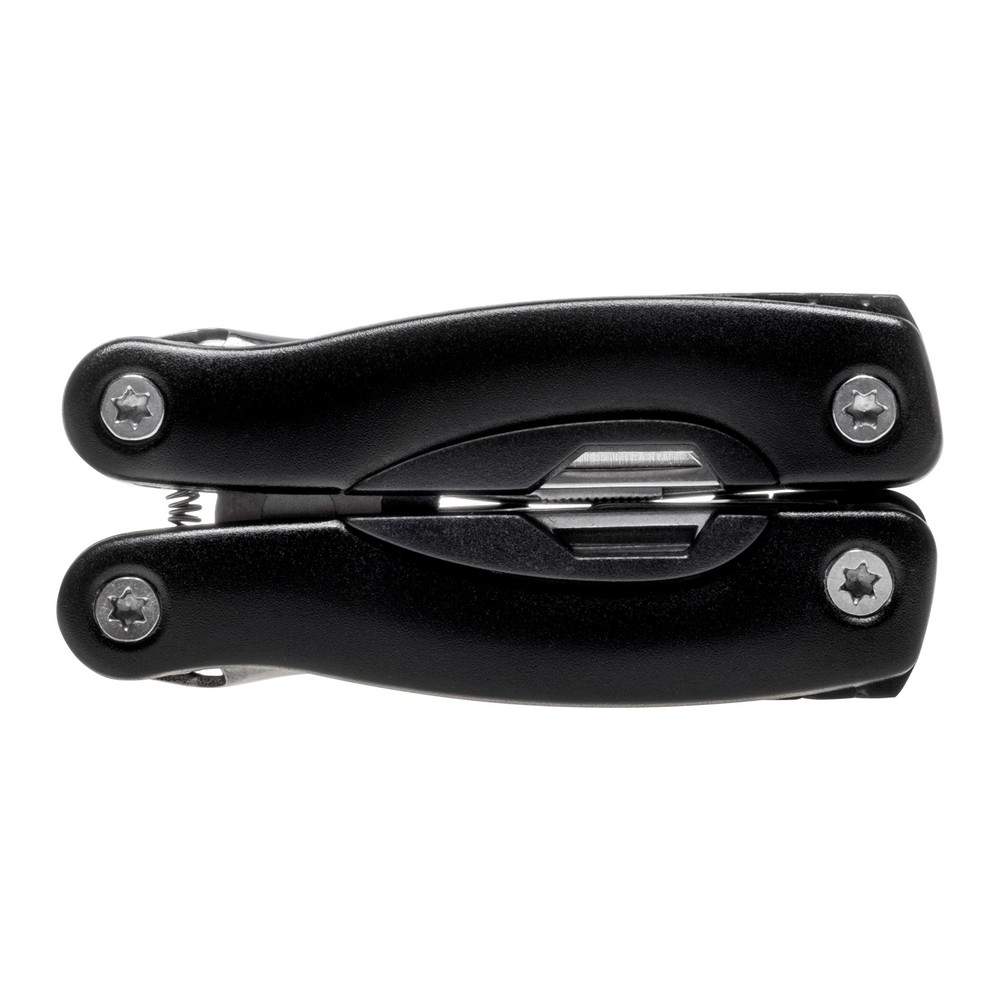 Narzędzie wielofunkcyjne w czarnym pokrowcu, posiada 12 funkcji oraz kolorowy uchwyt z czarnymi elementami, produkt wykonany z aluminium i stali nierdzewnej