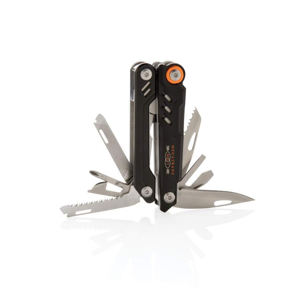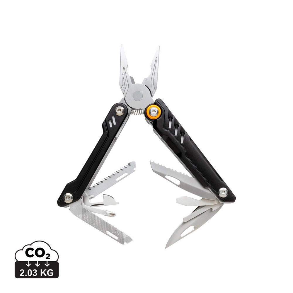Bardzo wytrzymałe narzędzie wielofunkcyjne, wykonane ze stali nierdzewnej, aluminiowy uchwyt, 13 funkcji: długie szczypce, kombinerki, przecinak do kabli i drutu, ostrze ząbkowane, otwieracz do butelek, duży śrubokręt płaski, średni śrubokręt płaski, nóż, pilnik, śrubokręt krzyżakowy, otwieracz do puszek, mały śrubokręt płaski, piła, etui z wysokiej jakości poliestru 1680D w komplecie, w ozdobnym pudełku, ślad węglowy produktu: 2,03 kg CO2