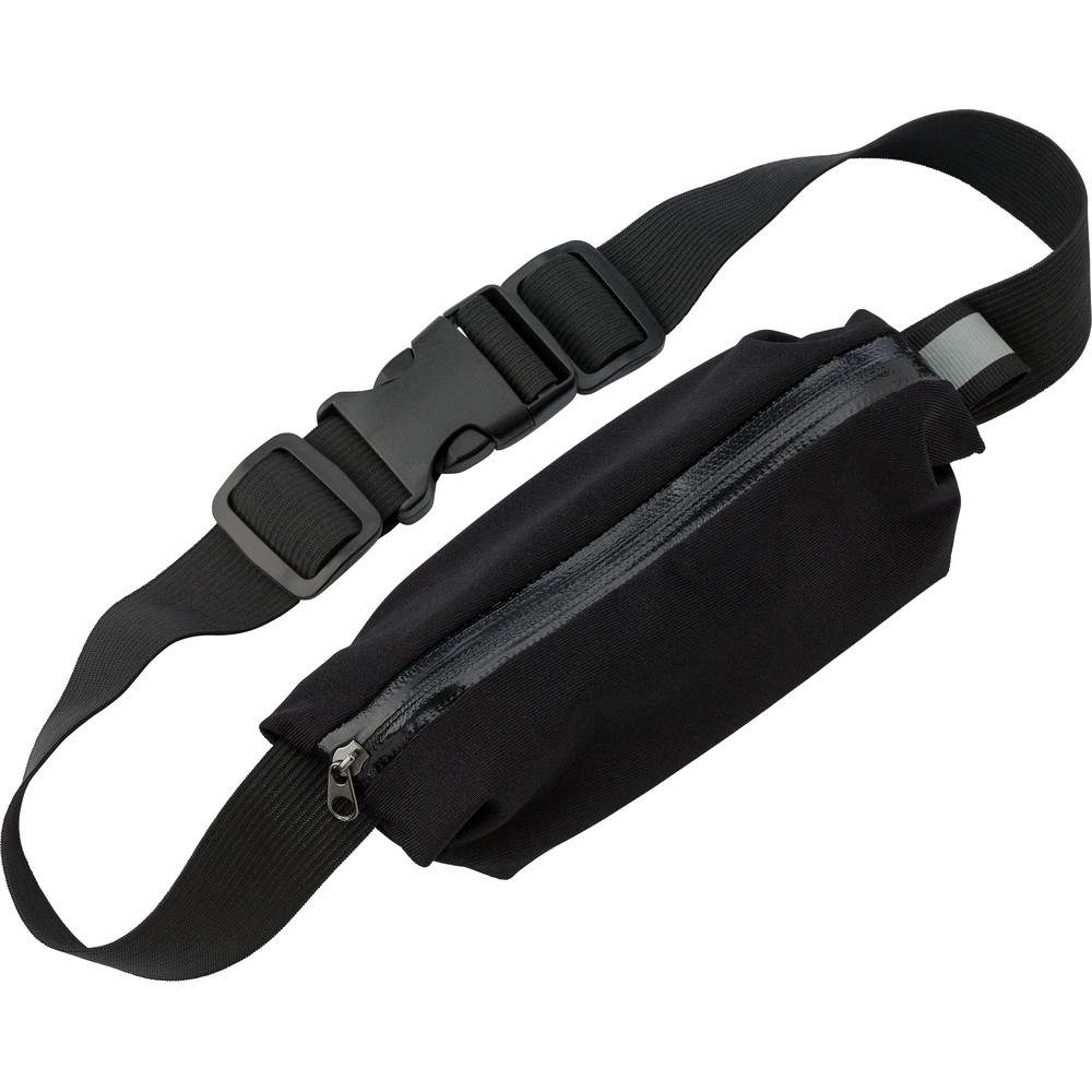 Nieprzemakalna saszetka zapinana w pasie na zamek, regulowany gumowy pasek z obu stron (2 x 27 cm) z plastikowym zapięciem, min. obwód ok. 62 cm, max. obwód ok. 93 cm (plus rozciągnięcie)