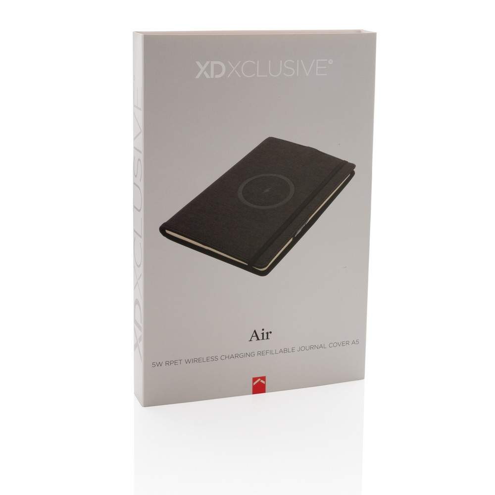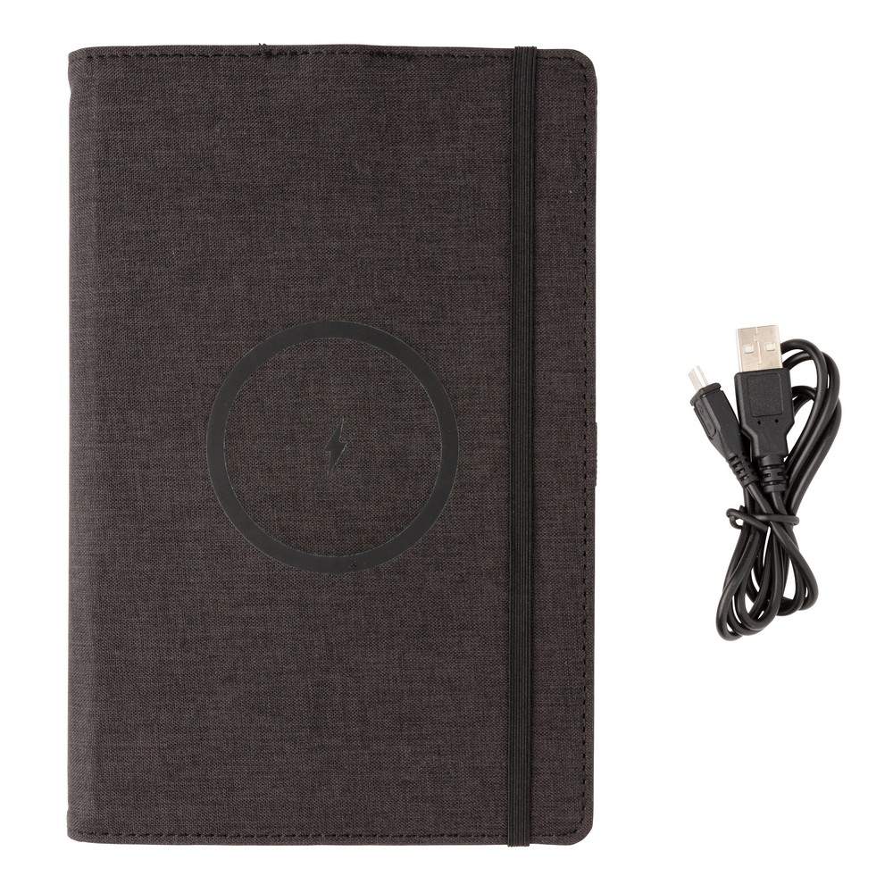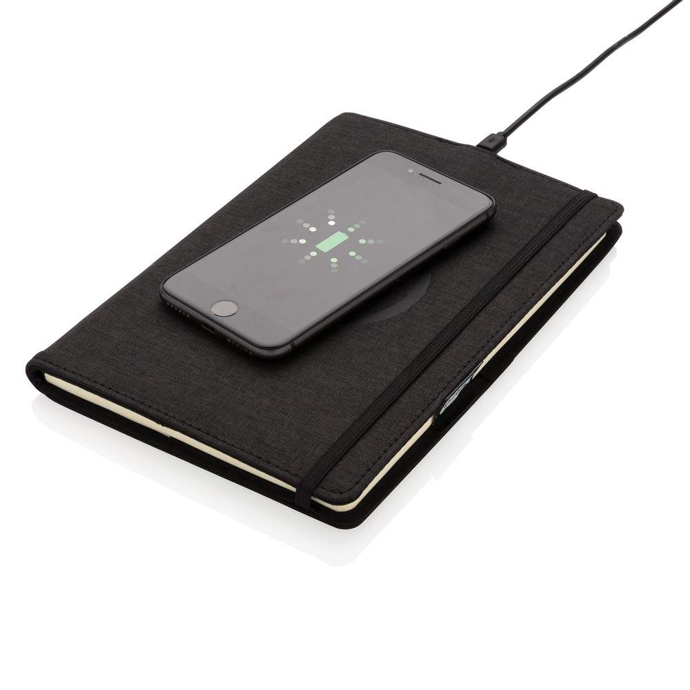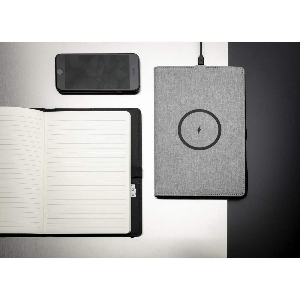 Notatnik A5 (80 kremowych kartek 70 g/m2 w linie), ładowarka bezprzewodowa 5W, okładka wielokrotnego użytku wykonana z RPET, elastyczna opaska do zamykania, bezprzewodowe ładowanie jest kompatybilne ze wszystkimi urządzeniami posiadającymi możliwość ładowania indukcyjnego, kabel micro USB 80 cm w komplecie, wzór zastrzeżony®, ślad węglowy produktu: 2,24 kg CO2