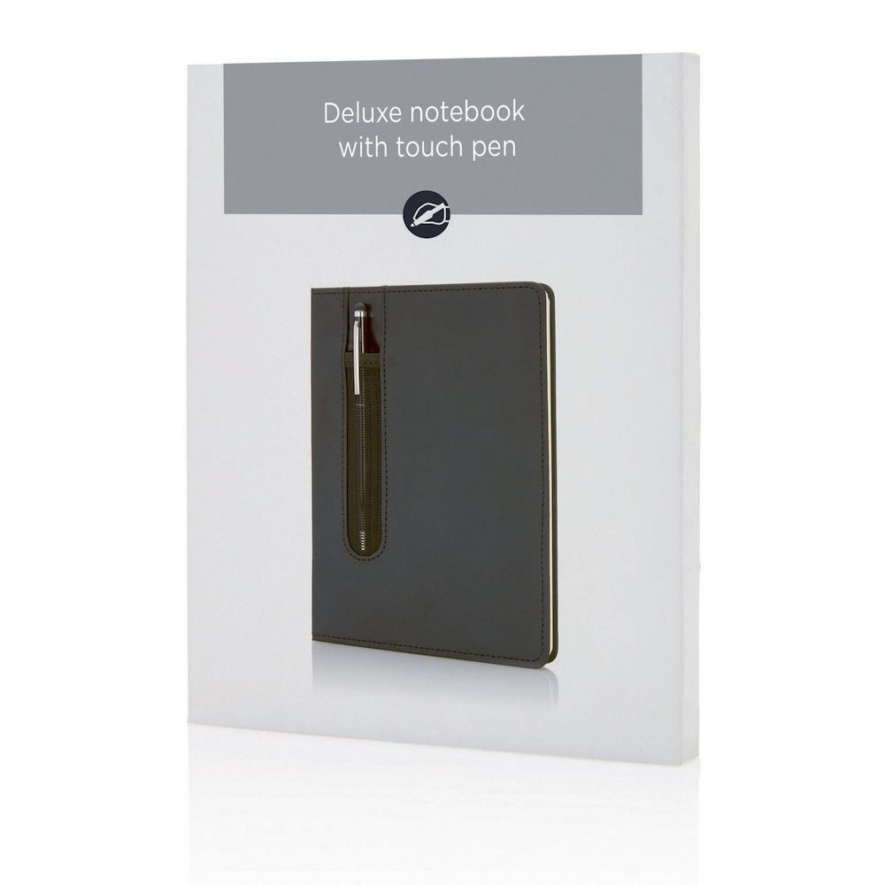 Notatnik A5 (80 kartek w linie), okładka z PU, miejsce na przybory do pisania i metalowy długopis, touch pen, w ozdobnym pudełku