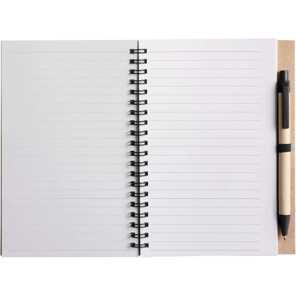 Notatnik w formacie ok. A5, posiada 60 kartek w linie (120 stron) i spiralne bindowanie, w komplecie znajduje się długopis z kolorowymi elementami, wkład w niebieskim kolorze, okładka wykonana z kartonu z kolorowym elementem przy bindowaniu