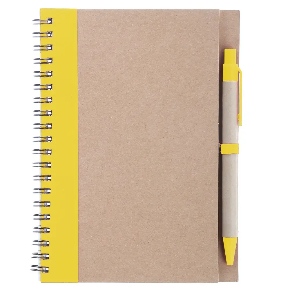 Notatnik w formacie ok. A5, posiada 60 kartek w linie (120 stron) i spiralne bindowanie, w komplecie znajduje się długopis z kolorowymi elementami, wkład w niebieskim kolorze, okładka wykonana z kartonu z kolorowym elementem przy bindowaniu