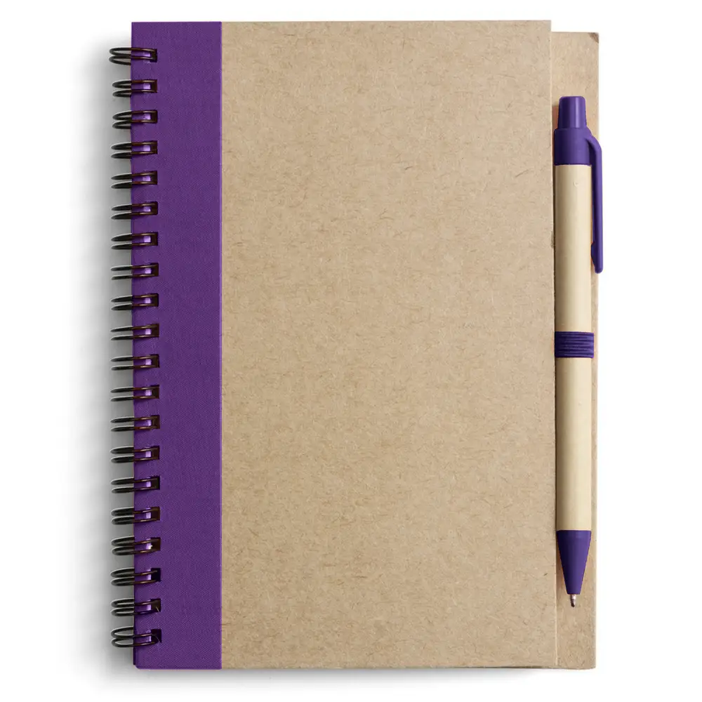 Notatnik w formacie ok. A5, posiada 60 kartek w linie (120 stron) i spiralne bindowanie, w komplecie znajduje się długopis z kolorowymi elementami, wkład w niebieskim kolorze, okładka wykonana z kartonu z kolorowym elementem przy bindowaniu