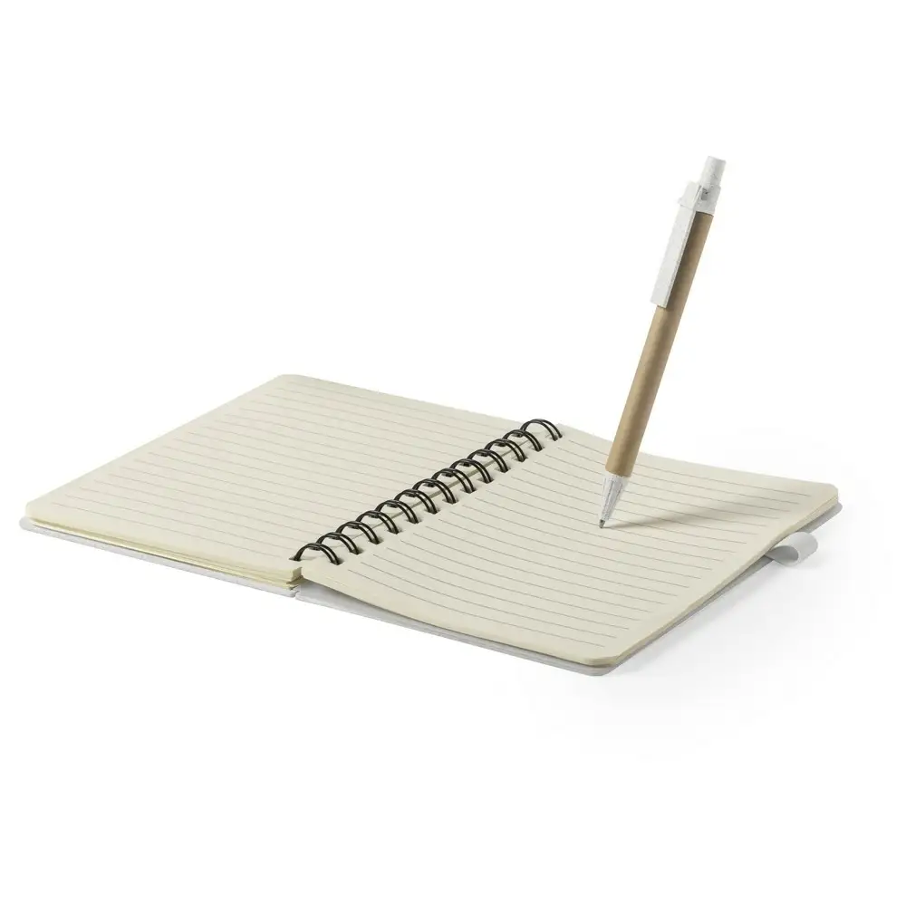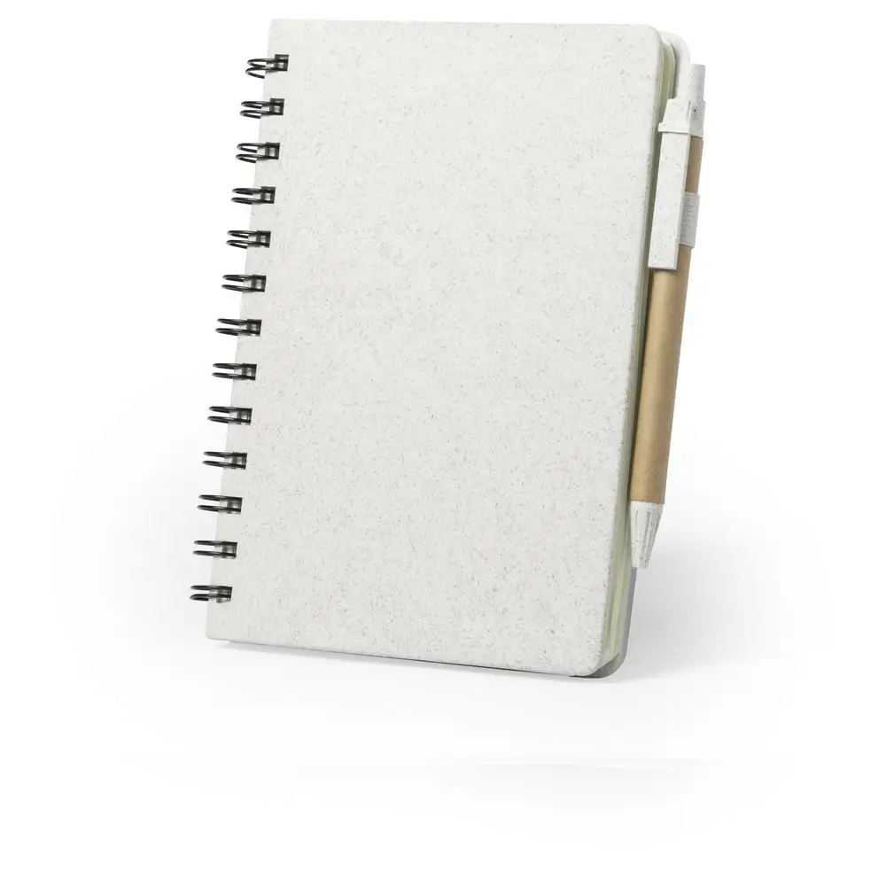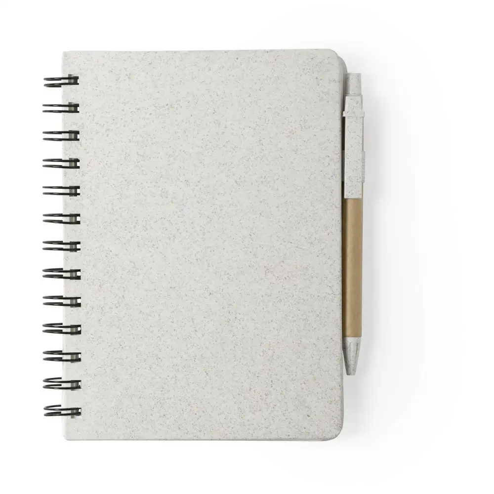 Notatnik (ok. A5, 80 kartek w linie) z włókien słomy pszenicznej, twarda okładka, długopis w komplecie, spiralne bindowanie