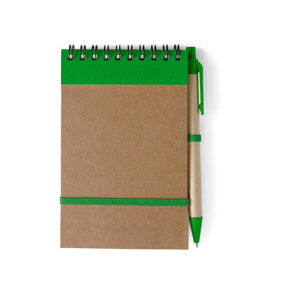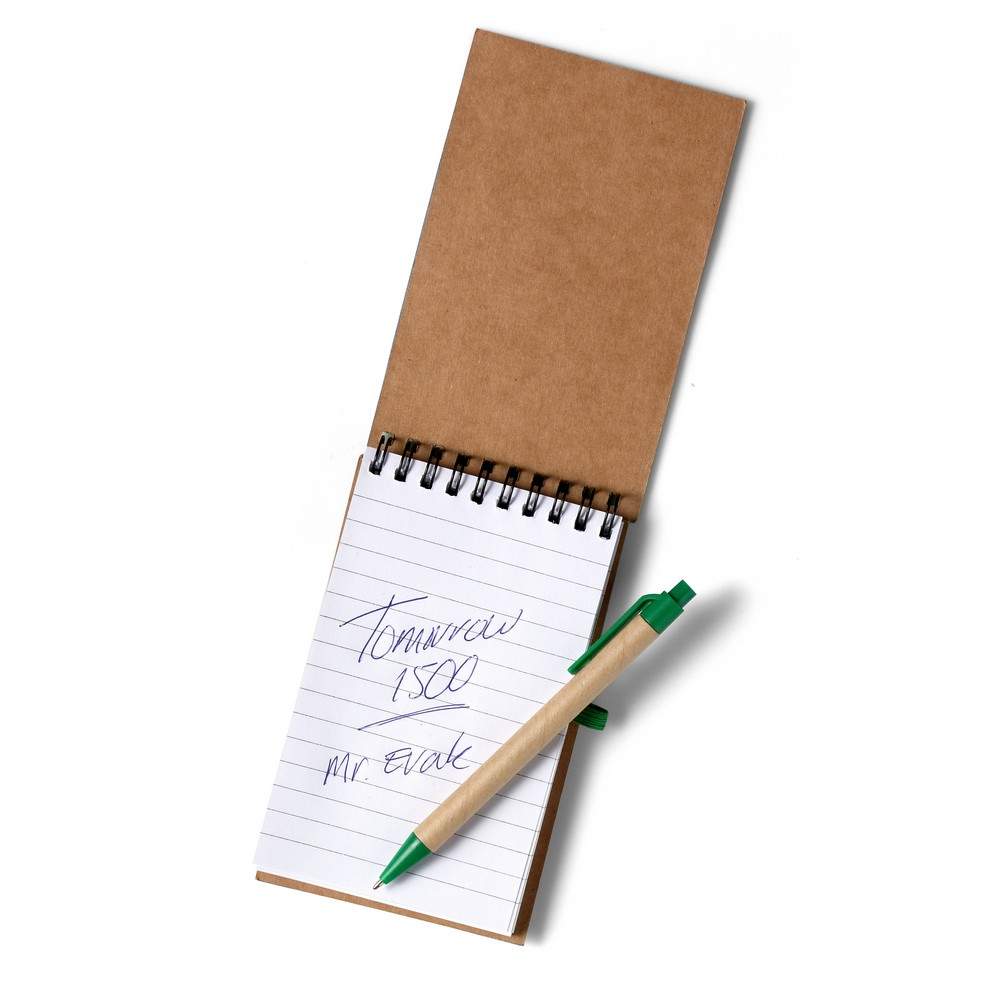 Notatnik reporterski w kieszonkowym formacie ok. A6, posiada 70 kartek w linie (140 stron) i spiralne bindowanie, dodatkowe zamknięcie w postaci dopasowanej kolorystycznie elastycznej opaski, w komplecie znajduje się długopis z kolorowymi elementami, wkład w niebieskim kolorze, produkt wykonany między innymi z kartonu