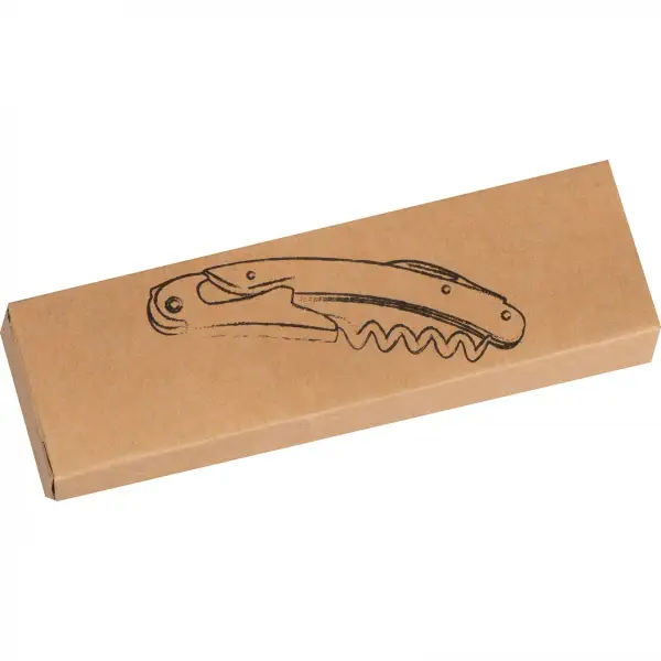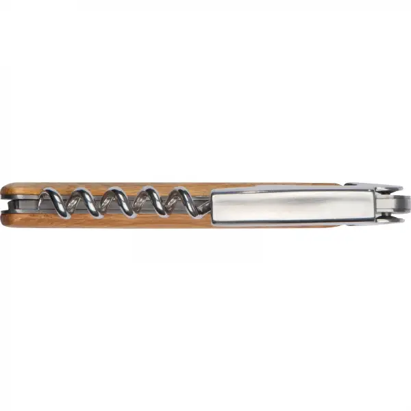 Nóż kelnerski z otwieraczem do butelek, nożykiem do folii i korkociągiem. Noż wykonany z metalu i drewna bambusowego.