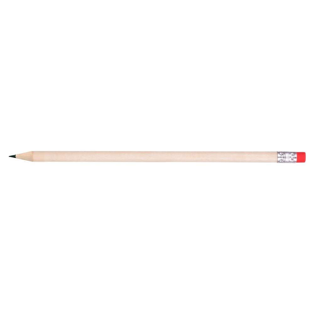 Ołówek z gumką, posiada naostrzoną końcówkę, produkt wykonany z drewna
