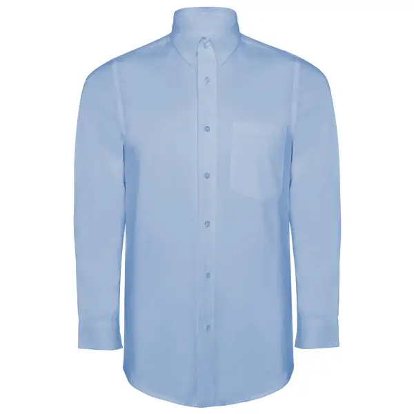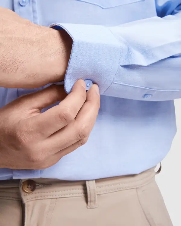 Koszula z długim rękawem.· Tkanina Oxford.· Klasyczny kołnierz do koszuli.· Przednie szwy na ramionach.· Tylny karczek.· Kieszeń na klatce piersiowej po lewej stronie.· Rozcięcie z zapięciem na guzik w tym samym kolorze. · Mankiety z podwójnym zapięciem na guziki z plisami i dodatkowym mniejszym zapięciem na guziki przy rozcięciu mankietu.· Zaokrąglone obszycie.