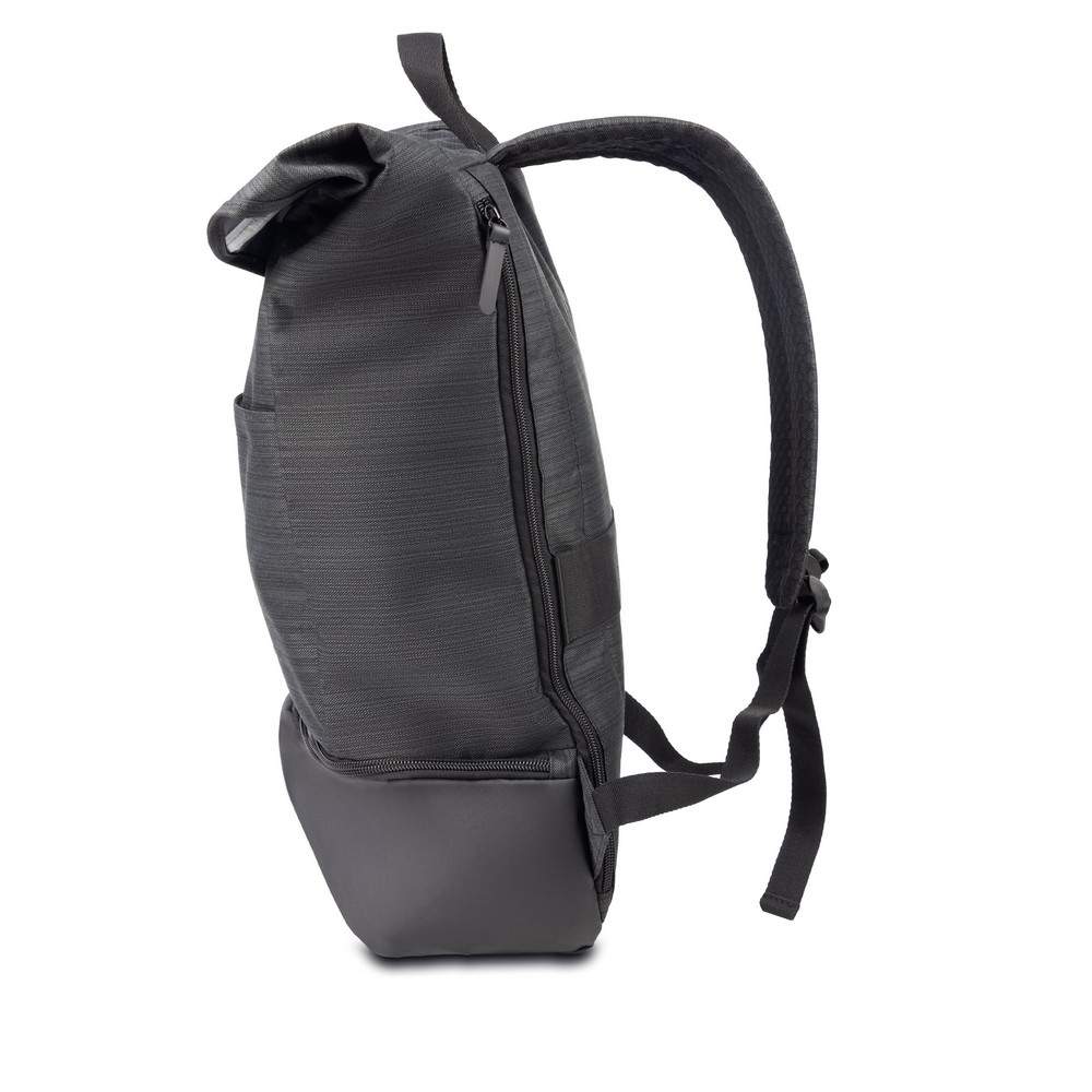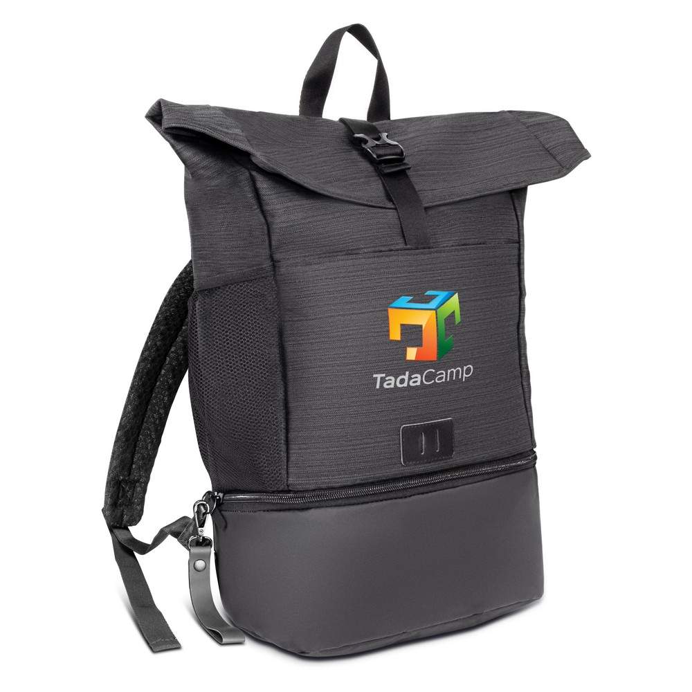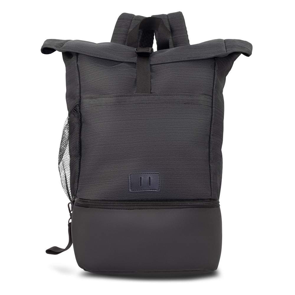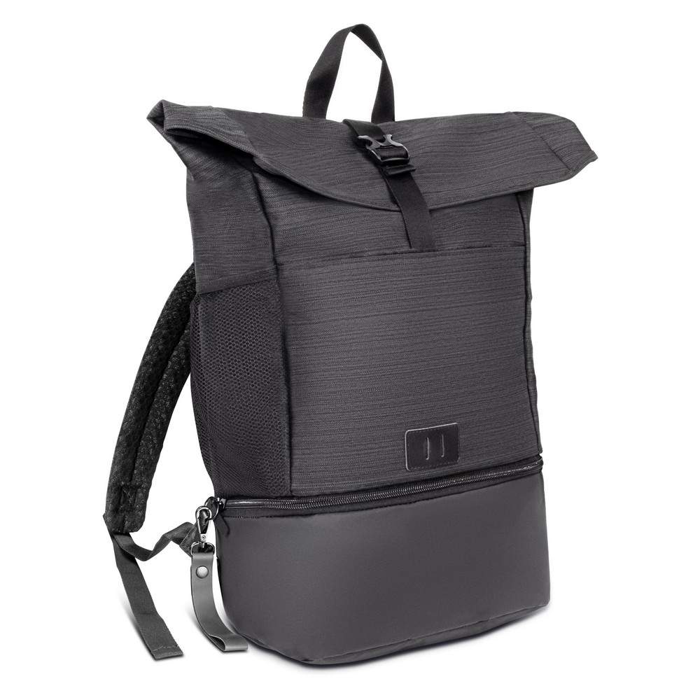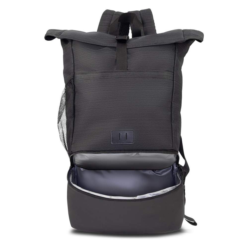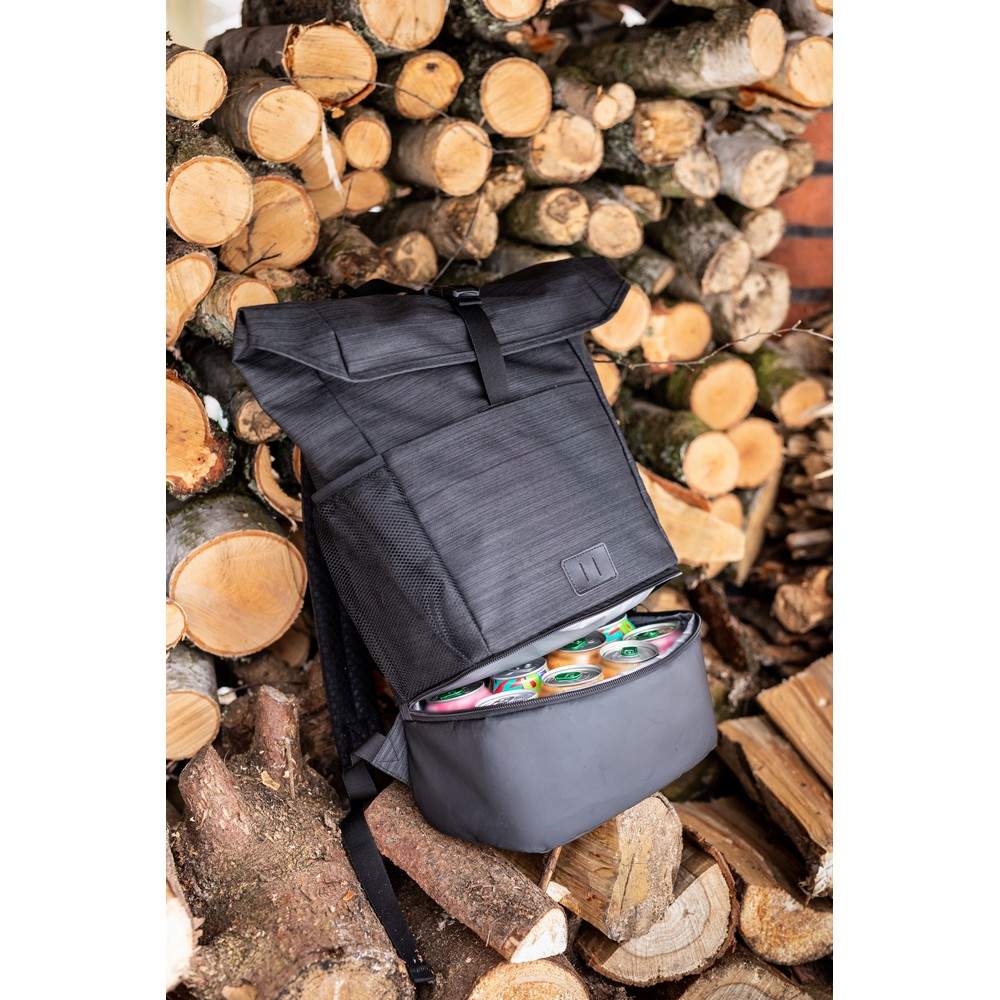 Plecak termoizolacyjny z przegrodą główną zamykaną na klamrę, pojemność: 15L, dolna przegroda termoizolacyjna mieszcząca do 8 puszek 0,33L zamykana na zamek błyskawiczny, boczna kieszeń siateczkowa, przednia kieszeń na rzep, na plecach kieszeń zamykana na zamek błyskawiczny, pasek do zamocowania na torbie podróżnej, miękki tył i regulowane paski na ramię