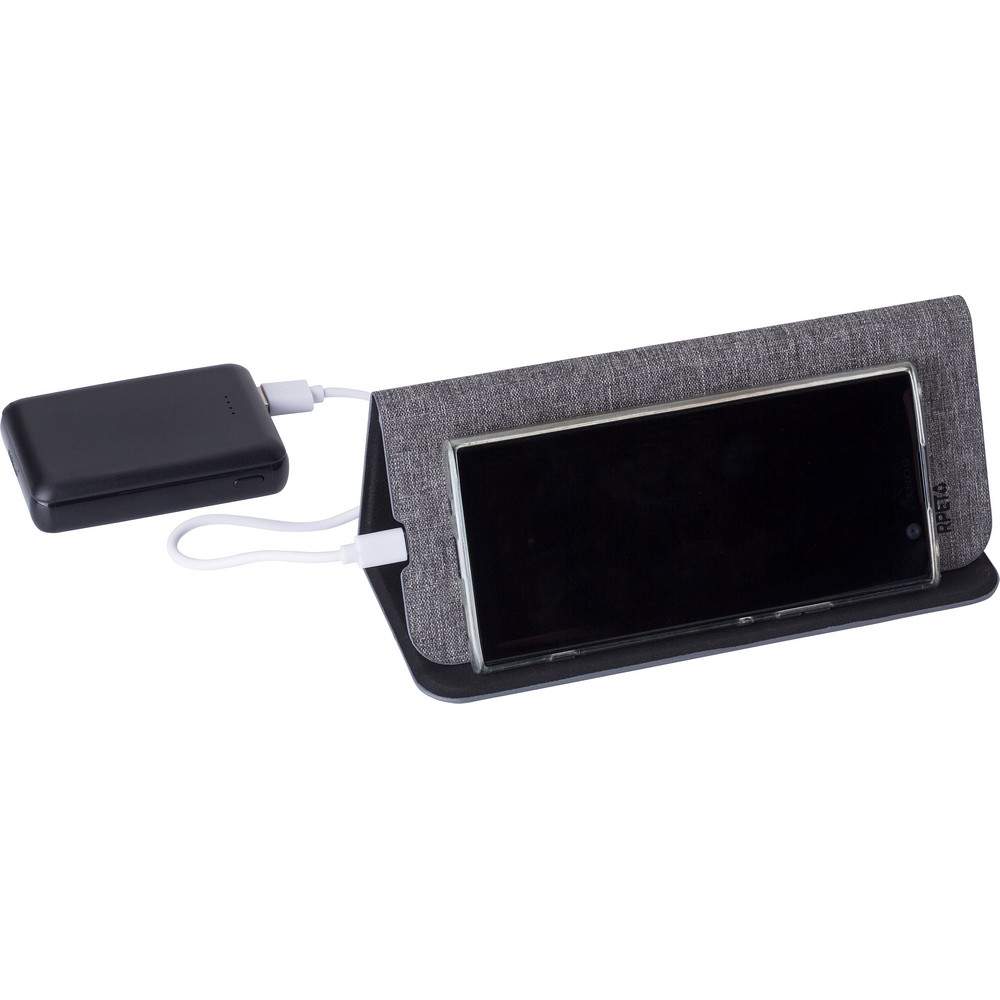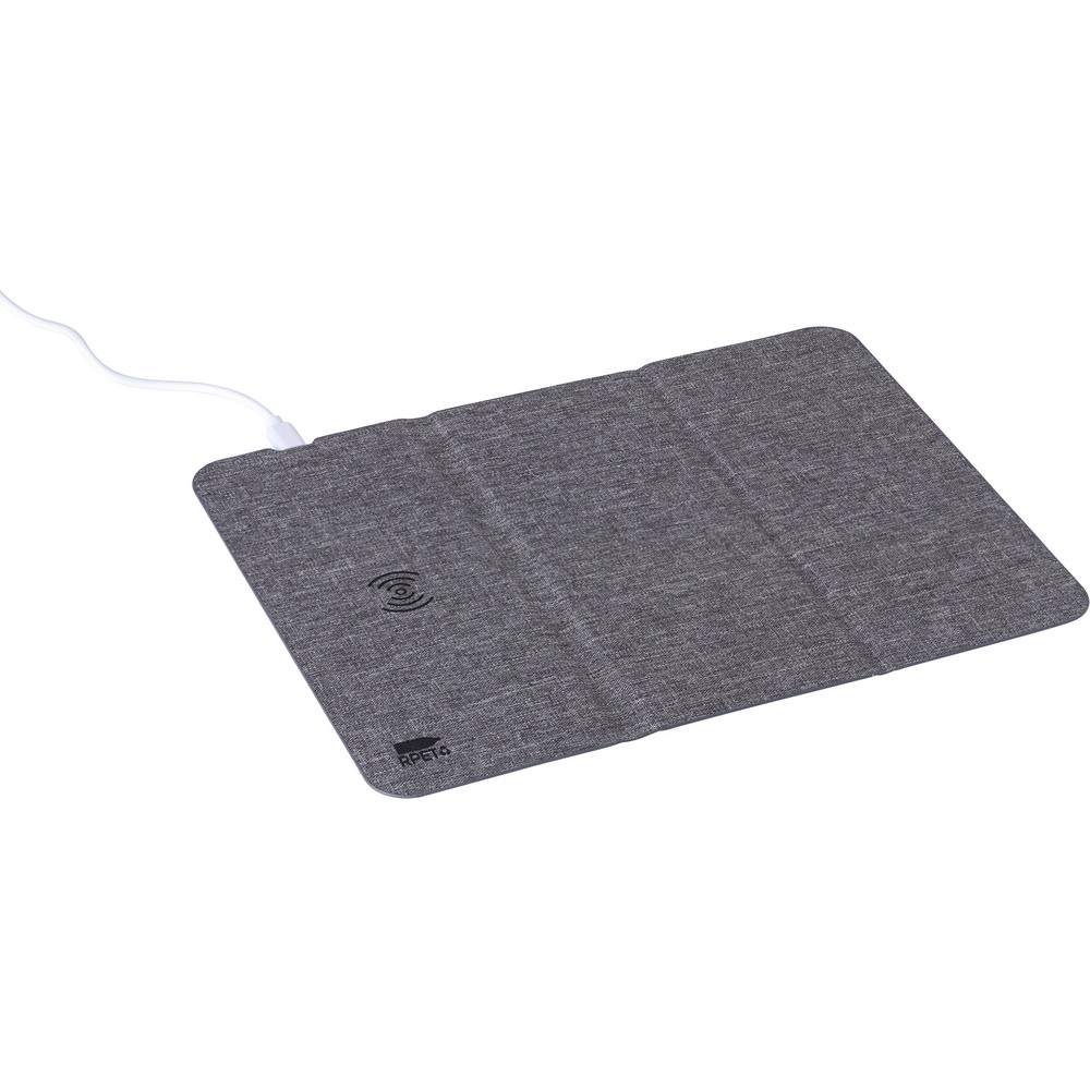 Podkładka pod mysz wykonana z poliestru RPET, ładowarka bezprzewodowa 10W, działa z telefonami posiadającymi możliwość ładowania indukcyjnego, stojak na telefon