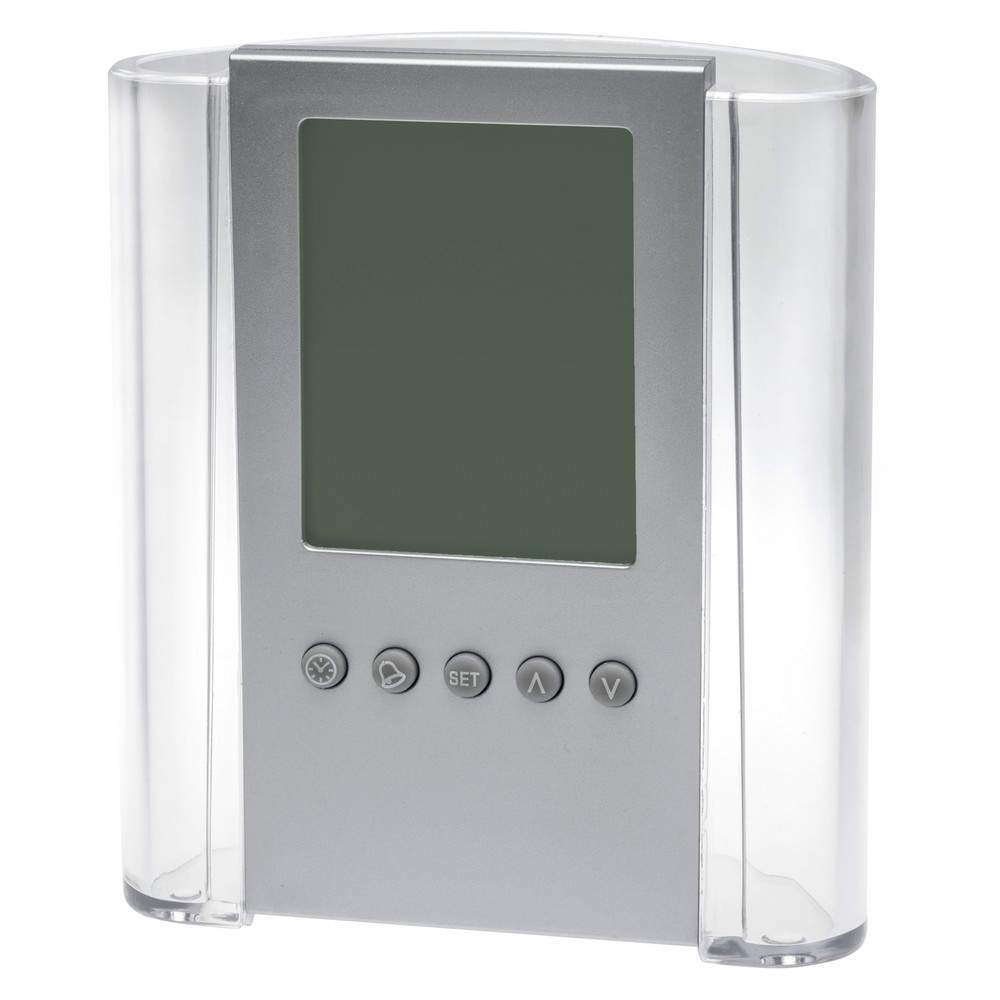 Przezroczysty pojemnik na przybory do pisania z kalendarzem, zegarem, alarmem i termometrem