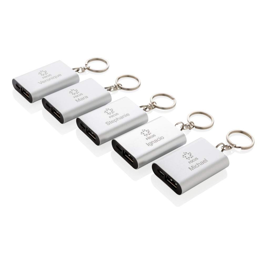Kompaktowy power bank 1000 mAh, brelok do kluczy, lekka aluminiowa obudowa, wbudowany akumulator litowy pozwala na naładowanie telefonu do 50%, wyjście USB 5V/1A, wejście 5V/1A, kabel micro USB w komplecie, ślad węglowy produktu: 0,77 kg CO2