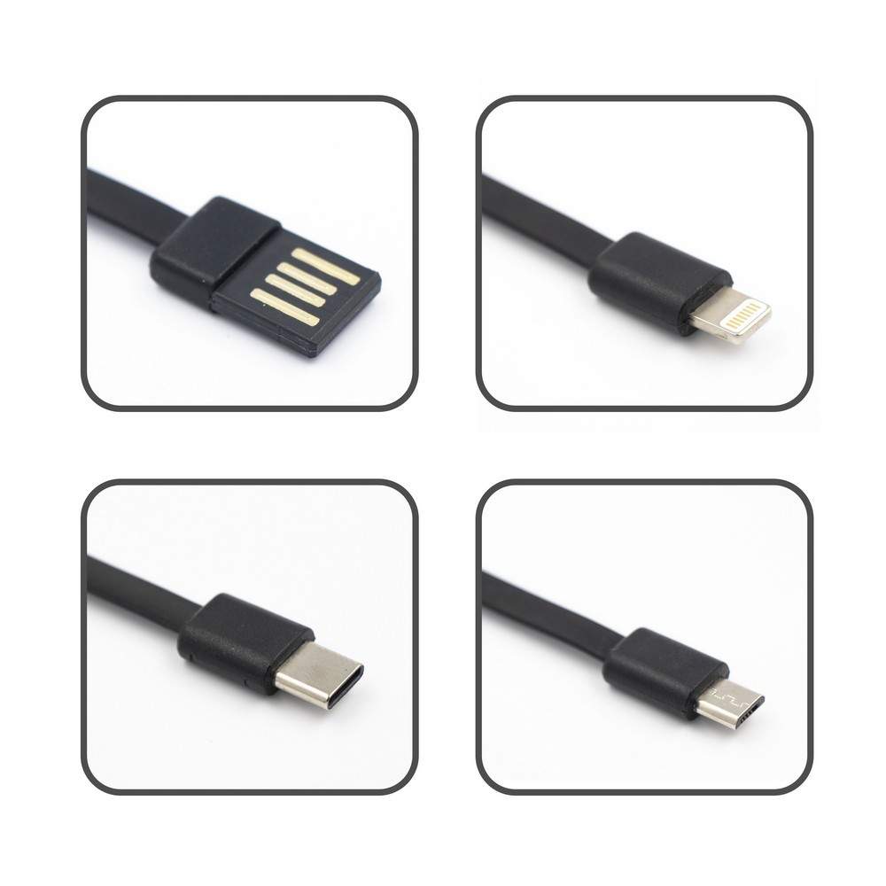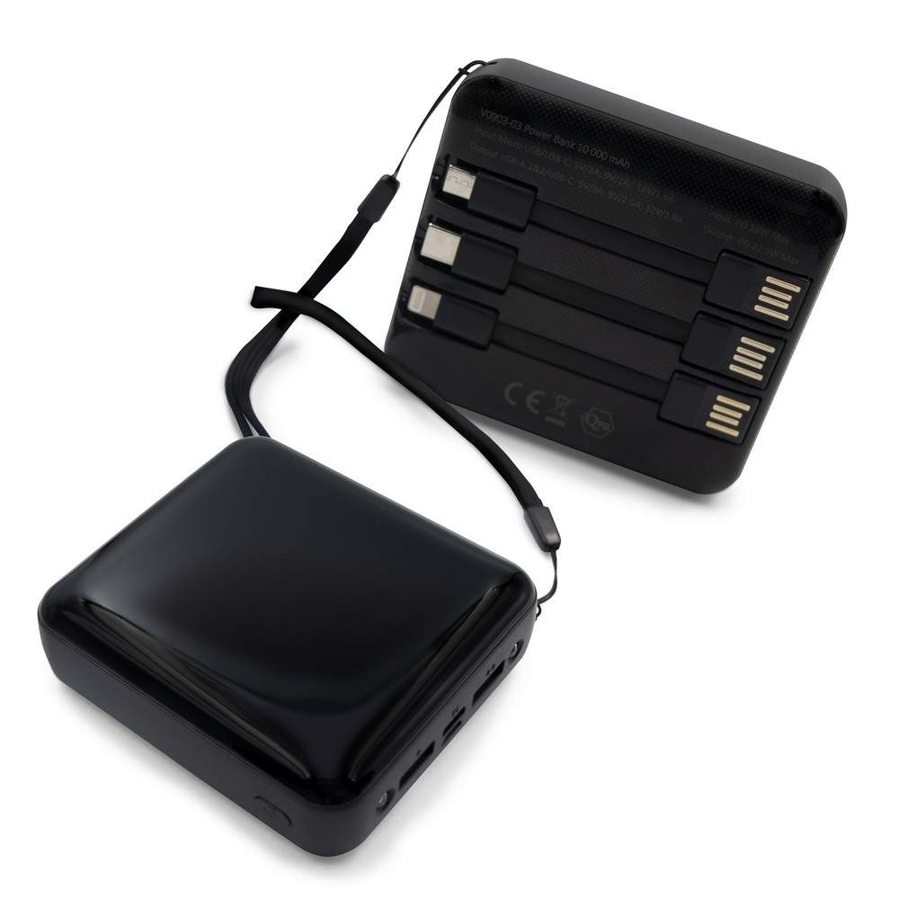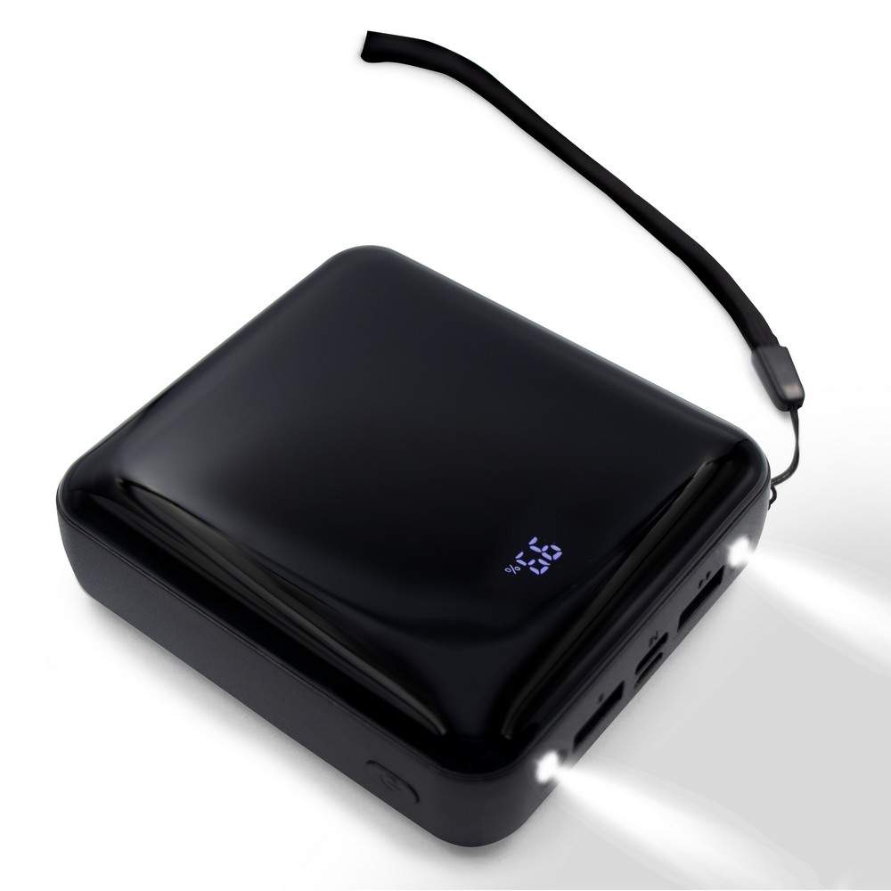 Power bank 10000 mAh z paskiem na rękę i 2 lampkami LED, cyfrowy wyświetlacz poziomu naładowania, wejście micro USB, wejście/wyjście USB-C, 2 wyjścia USB, możliwość ładowania trzech urządzeń jednocześnie (wymaga dodatkowego kabla z wejściem USB-C, nie jest dołączony), w komplecie 3 kable do ładowania: kabel z końcówką USB oraz końcówką kompatybilną z urządzeniami iOS, kabel z końcówką USB oraz USB-C, kabel z końcówką USB oraz micro USB