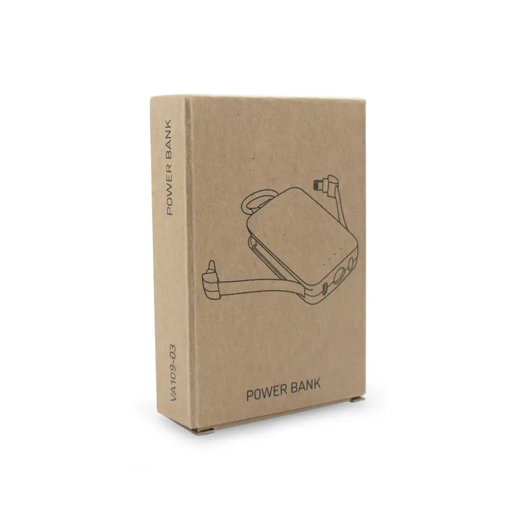Power bank 4000 mAh z karabińczykiem umożliwiającym przypinanie, może zmieścić się w kieszeni czy większości przegródek w plecaku, posiada wbudowaną lampkę o mocy 1W i 3 trybami świecenia: światło stałe (2 tryby) i światło migające (komunikat typu SOS), światło stałe słabsze, 2 zintegrowane kable: USB-C i z końcówką kompatybilną z urządzeniami iOS co umożliwia jednoczesne ładowanie dwóch urządzeń o różnych złączach, posiada 4 diody wskazujące poziom naładowania, czas działania lampki na 1 cyklu ładowania power banku: > 24h, wejście USB-C, w komplecie kabel USB-C, produkt wykonany z ABS i metalu