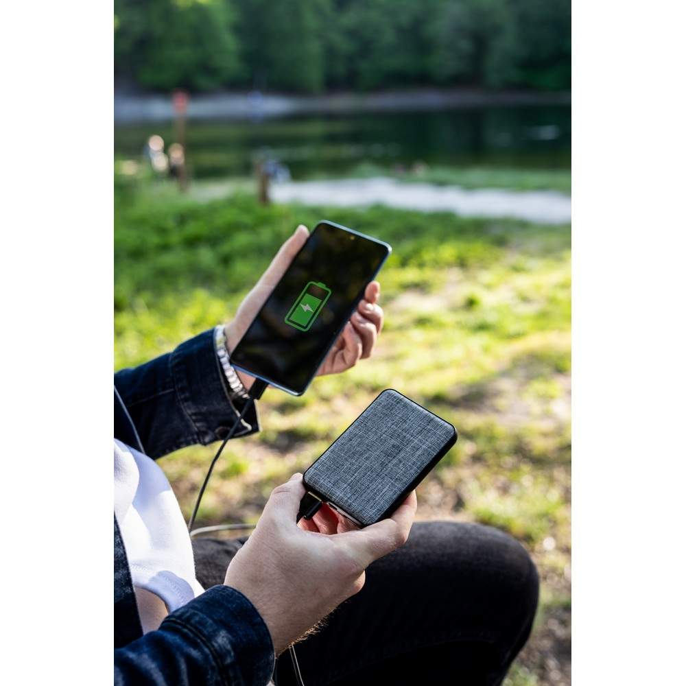 Power bank 5000 mAh z frontem wykonanym z RPET, 4 diody wskazujące poziom naładowania, 2 wyjścia USB (5V/2A), 2 wejścia (5V/2A): micro USB oraz USB typu C, kabel micro USB w komplecie