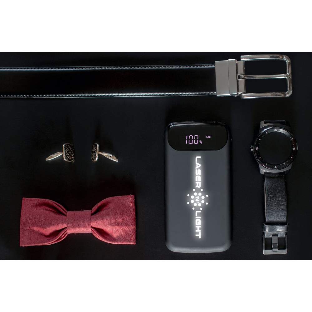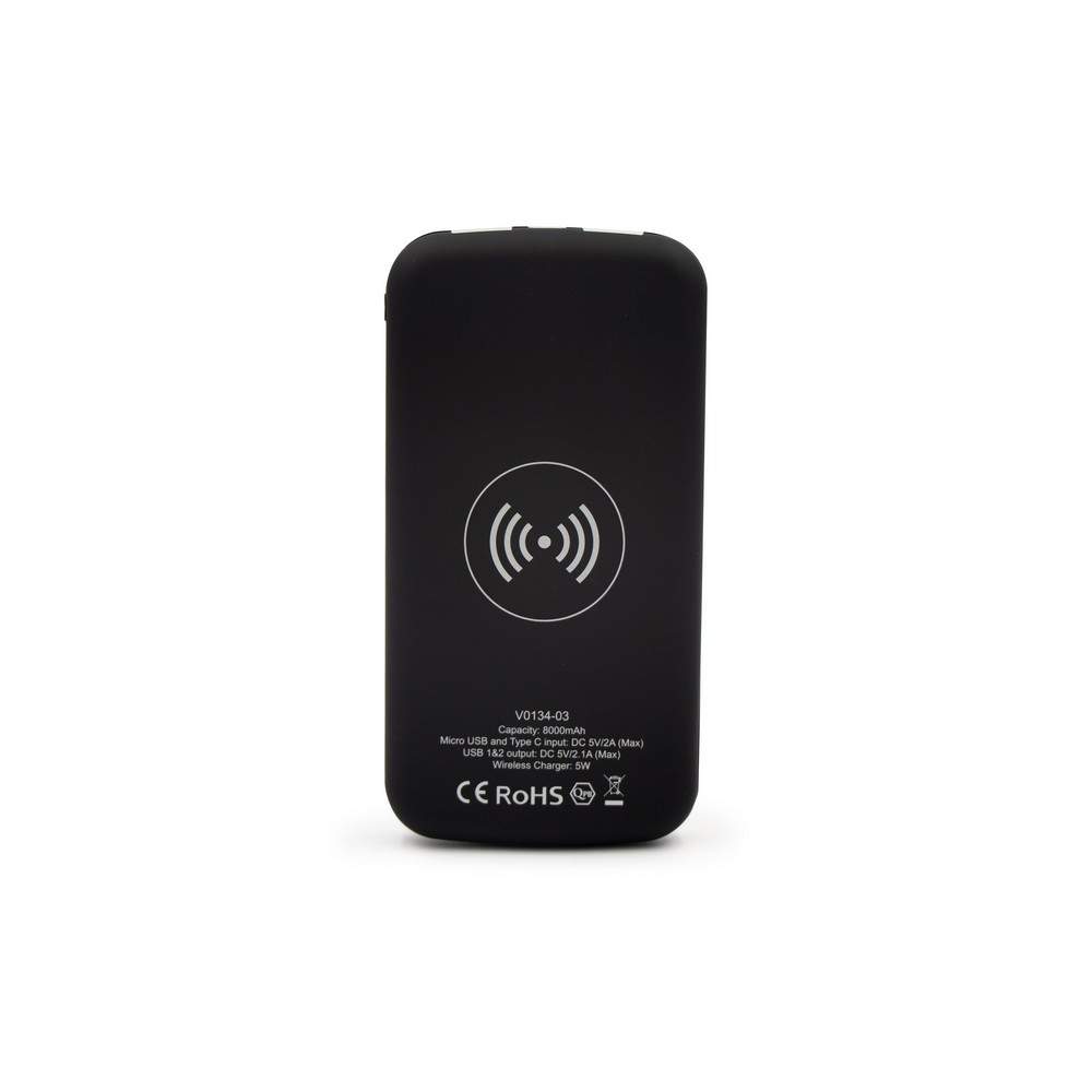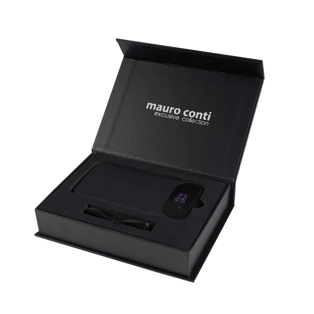 Bezprzewodowy power bank Mauro Conti 8000 mAh, ładowarka bezprzewodowa 5W, działa z urządzeniami posiadającymi możliwość ładowania indukcyjnego, wejścia (max. 5V/2A) USB-C oraz micro USB, 2 wyjścia USB (max. 5V/2.1A) do ładowania dwóch urządzeń jednocześnie, cyfrowy wyświetlacz poziomu naładowania, grawer ukazuje podświetlaną powierzchnię, etui i kabel micro USB w komplecie, w ozdobnym pudełku na magnes