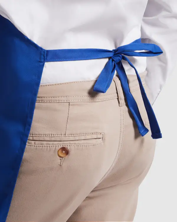 Długi fartuch z tkaniny o splocie ukośnym.· Stały pasek na szyję z pasującej tkaniny.· Wiązania z pasującej tkaniny umożliwiające regulację w pasie. Bez kieszeni.