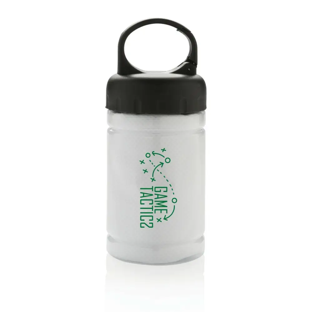 Ręcznik chłodzący z mikrofibry w pojemniku z PP, wieczko z ABS, ochrona przeciwsłoneczna na poziomie 98% i do UV 50+, funkcja chłodzenia po wlaniu zimnej wody do butelki, karabińczyk w komplecie, wymiar po rozłożeniu 77 x 30cm, ślad węglowy produktu: 0,8 kg CO2