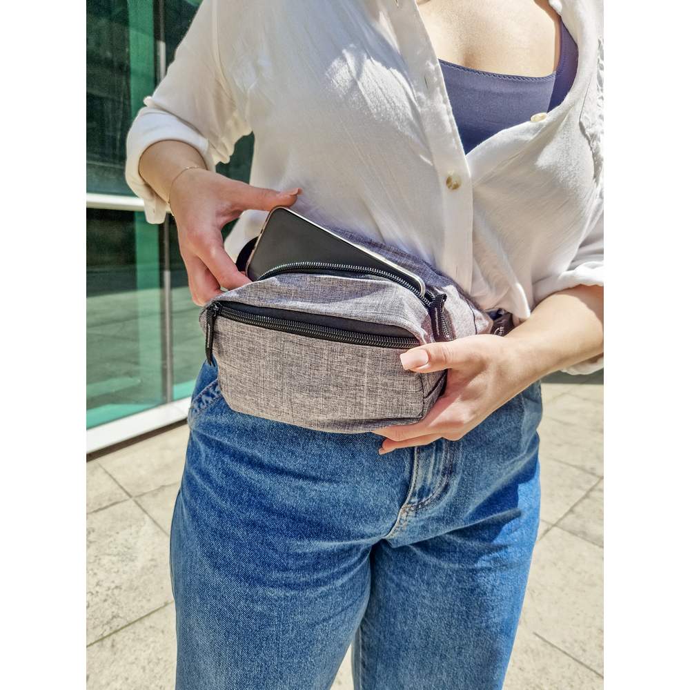Saszetka zapinana w pasie B'RIGHT, wykonana z RPET, zgodna z certyfikatem GRS (Global RecycIed Standard), przegroda główna oraz przednia na zamek błyskawiczny, szeroki i regulowany pas biodrowy, solidna klamra, min. obwód ok. 87,5 cm, max. obwód ok. 122,5 cm