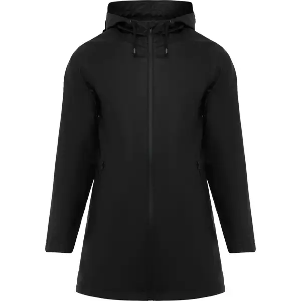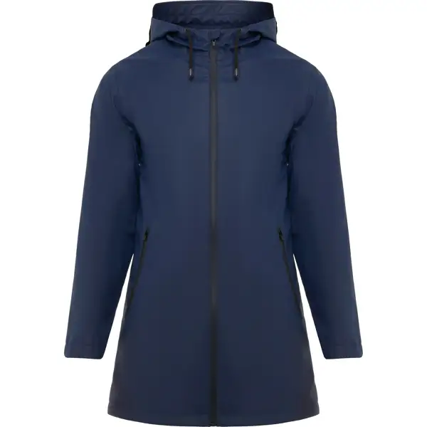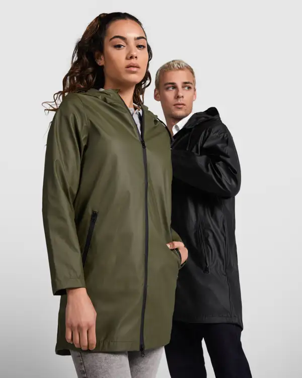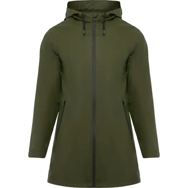 Płaszcz przeciwdeszczowy wodoodporny ze stałym kapturem i daszkiem, lekko dopasowany w pasie. Dwukierunkowy zamek błyskawiczny z przodu, kieszenie boczne i zgrzewane szwy. Regulowany ściągacz w kapturze. Otwór tylny. Dostęp do dalszych procesów produkcyjnych na plecach.